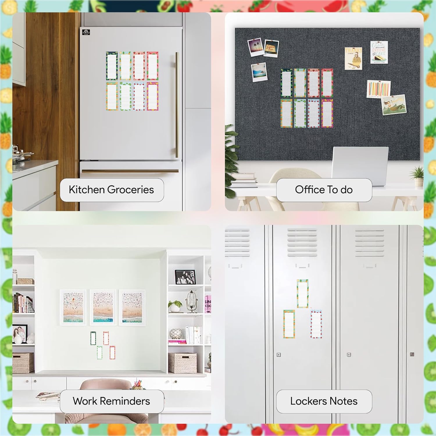 - BEAUTIFUL & REALISTIC FRUIT DESIGN - These 8 stick-and-go magnet note pads stand out because of their aesthetically designed borders, featuring a realistic and refreshing summer watermelon, a cute avocado, a retro banana theme, a succulent kiwi, juicy pineapples, mouthwatering strawberries, and fresh orange with natural colors. Perfect for use as fridge note pad, grocery list note pad, to do list note pad