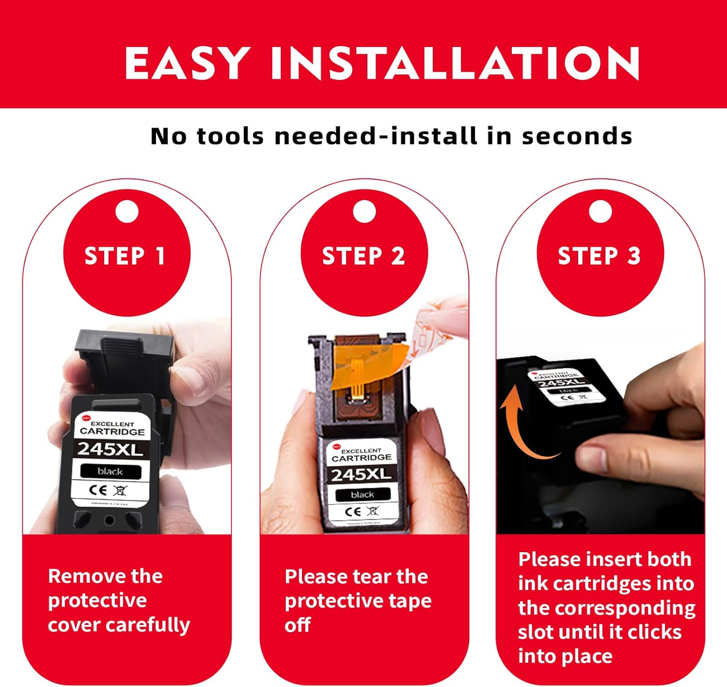 - Wide Printer Compatibility: Replacement for Canon Canon 245XL Black Ink, 245XL Ink Cartridges, fit for Canon 243 Black Ink, PG-243 243XL PG-245,Compatible for Canon MX490 MX492 MG2500 MG2522 MG2525 MG3022 MG2920 TS3100 TS3122 TS3300 TS3322 TR4500 TR4522 TR4520 printers (full list in description). Ensures seamless installation with smart chip recognition, eliminating compatibility errors for home offices and students