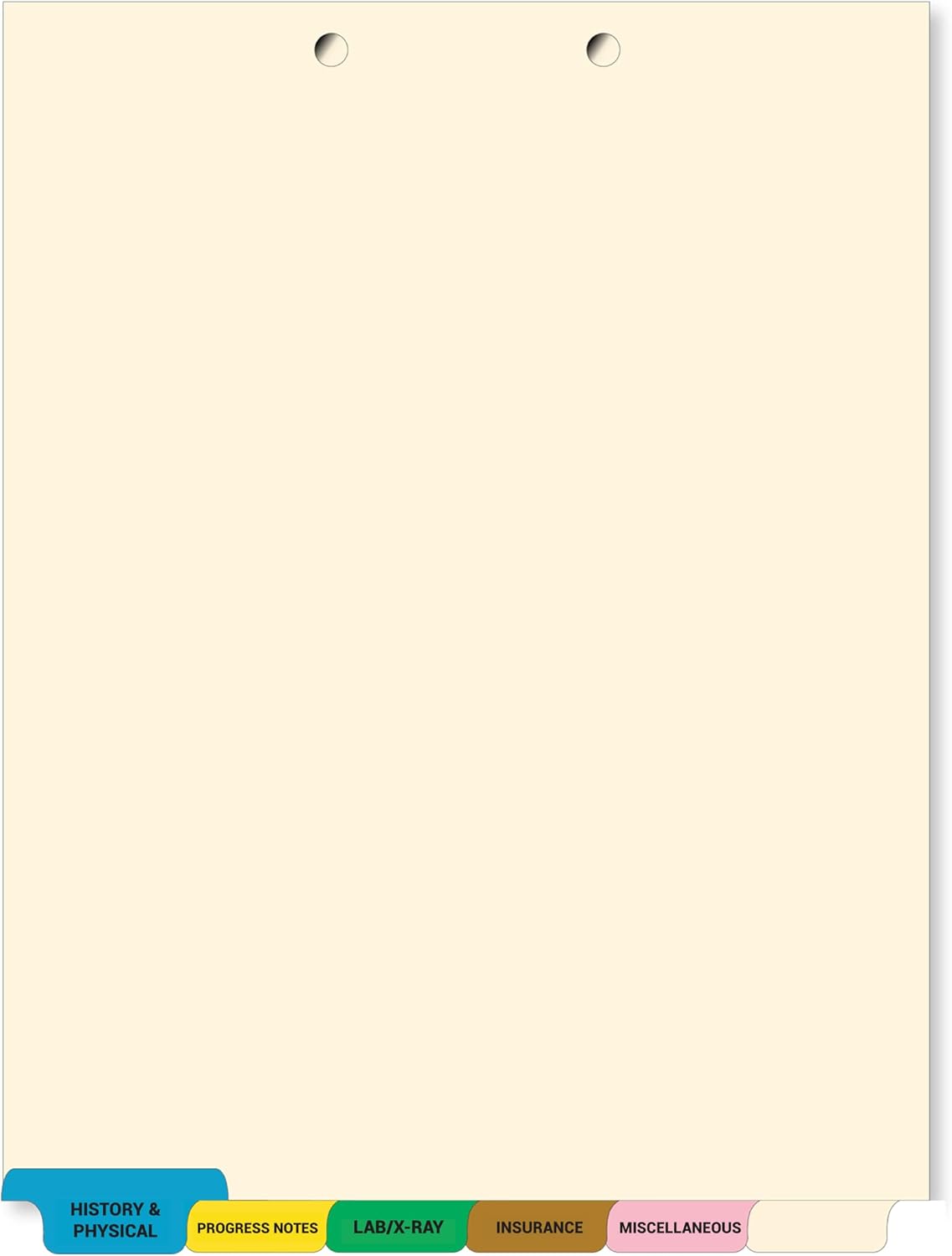 - DIVIDER SET DETAILS: Each set of file dividers is pre collated and has 6 color coded tabs. Each set consists of the following pre printed tab titles: Position 1 - HISTORY & PHYSICAL (Blue Colored Tab), Position 2 - PROGRESS NOTES (Yellow), Position 3 - LAB/X-RAY (Green), Position 4 - INSURANCE (Brown), Position 5 - MISCELLANEOUS (Pink), Position 6 - BLANK WRITE-ON. Contains 260 complete sets of 6 index tabs.