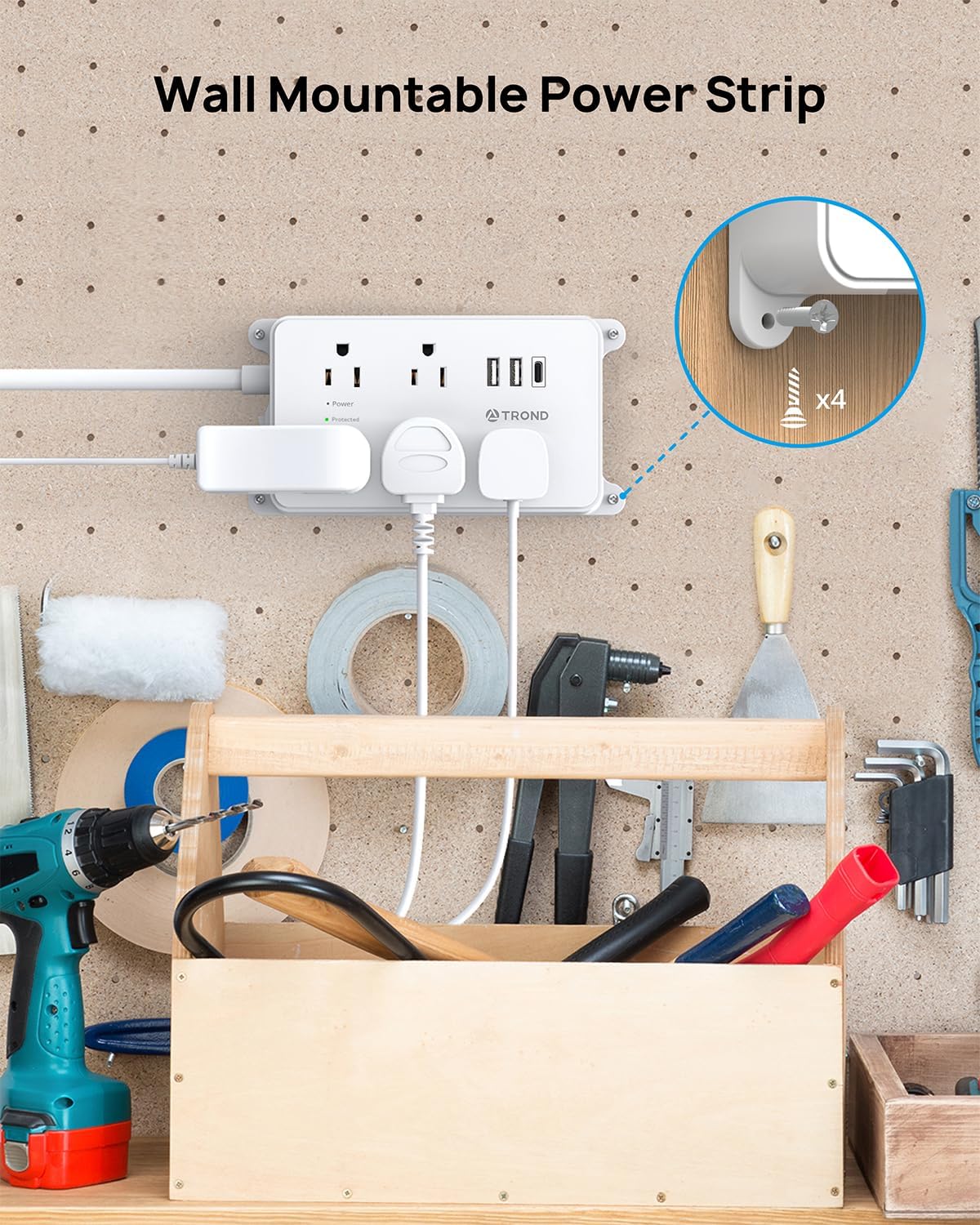 - Power Strip Wall Mountable: This wall mount power strip is a screw mountable design. Four screw-mounting tabs allow you to securely install this power strip and easily be reached, including behind the TV, workbench, garage, bedside, bathroom, laundry room, or under desk or cabinet, which is very low-profile and saves desktop space for you