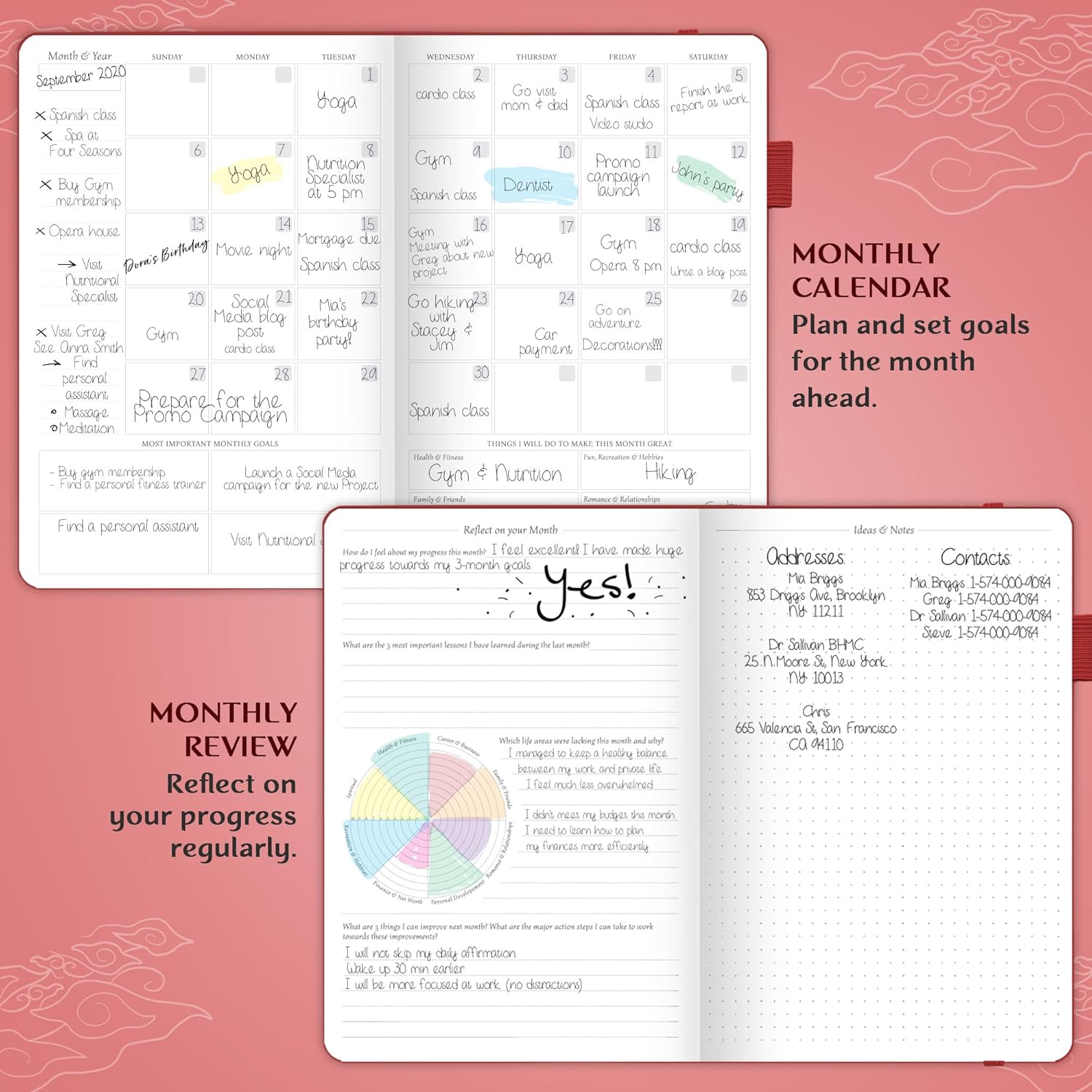- A5 SIZE, STICKERS & USER GUIDE – This planner organizer comes in A5 size (5.8x8.3 inches), with an eco-leather hardcover, thick 120gsm paper, lay-flat binding, pen loop, elastic band, 3 bookmarks, pocket for notes, 3 sheets of stickers, and user guide.