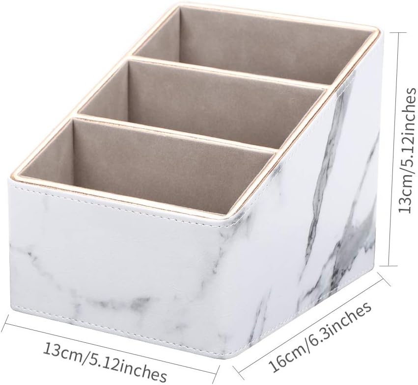 KINGFOM Remote Control Holder with 3 Compartments, Pu Leather Remote Caddy Desktop Organizer for TV, CD, Blu-Ray, Media Player, Heater Controllers and Cosmetics Office Supplies (White Marble)