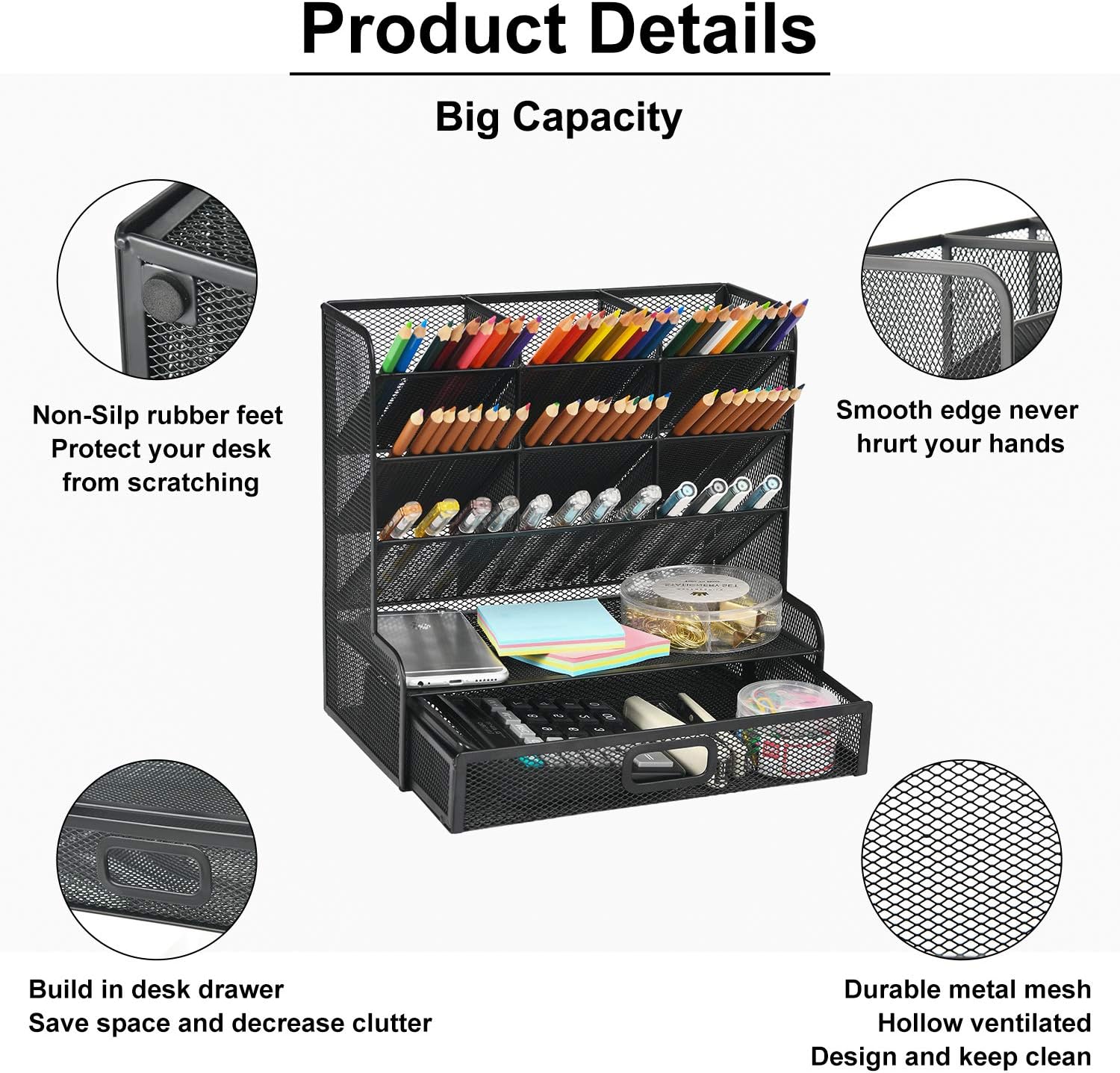 Marbrasse Mesh Pen Holder for Desk, Multi-Functional Pencil Organizer with Drawer, Desk Organizers and Accessories for Office Art Supplies (Large Black)