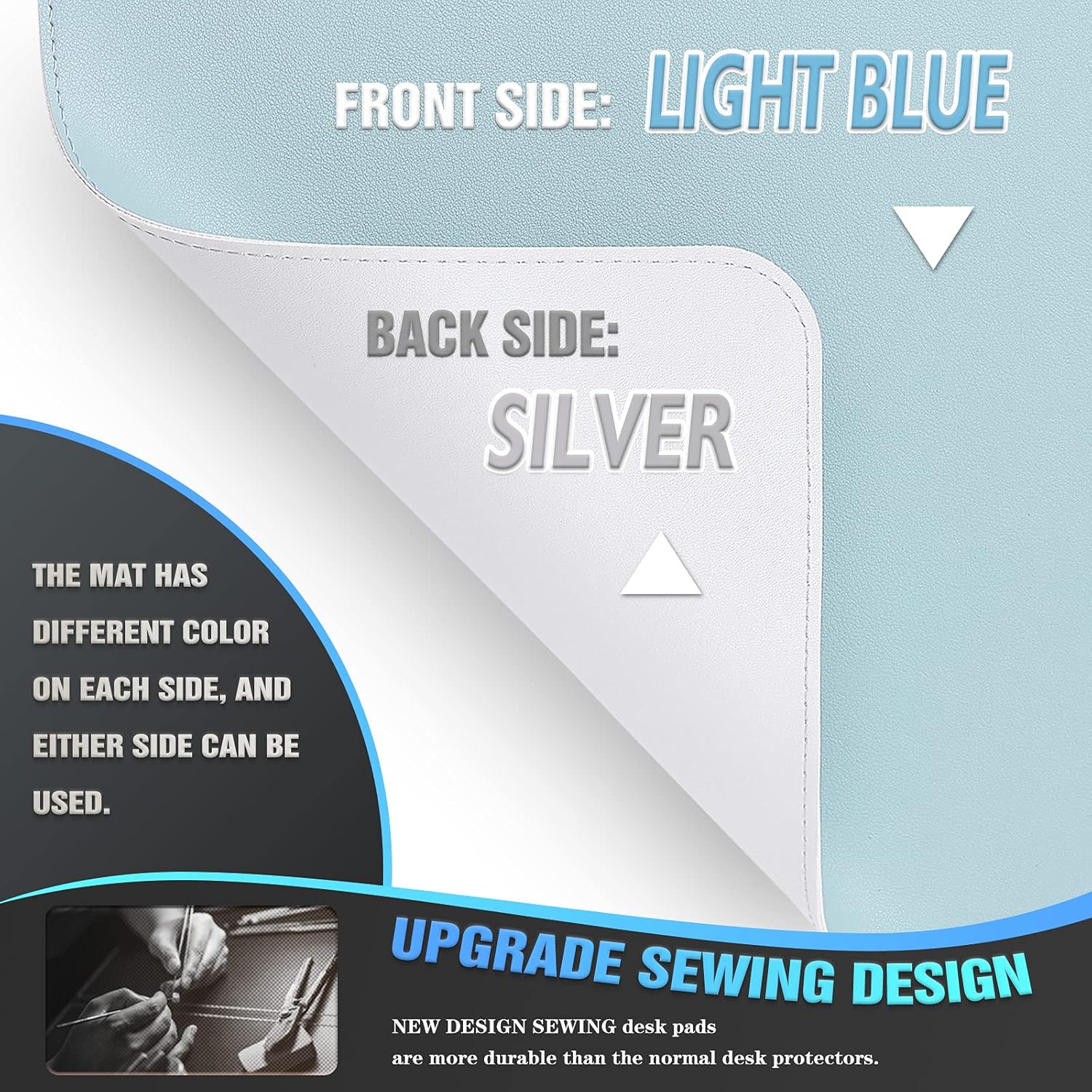 - DOUBLE-SIDED USE: We designed the desk pad with the same material but with different colors on each side, and you can use both sides. Come with a strap to roll up the pad and you can easily take it to anywhere. And also easy to store.