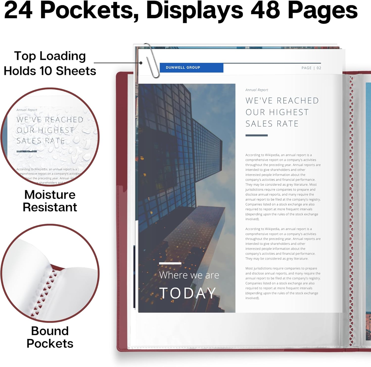 - PRESENTATION READY: 24 bound sleeves display 48 pages, Perfect for client meetings, business presentations, job interviews. Make a great impression while protecting your documents.