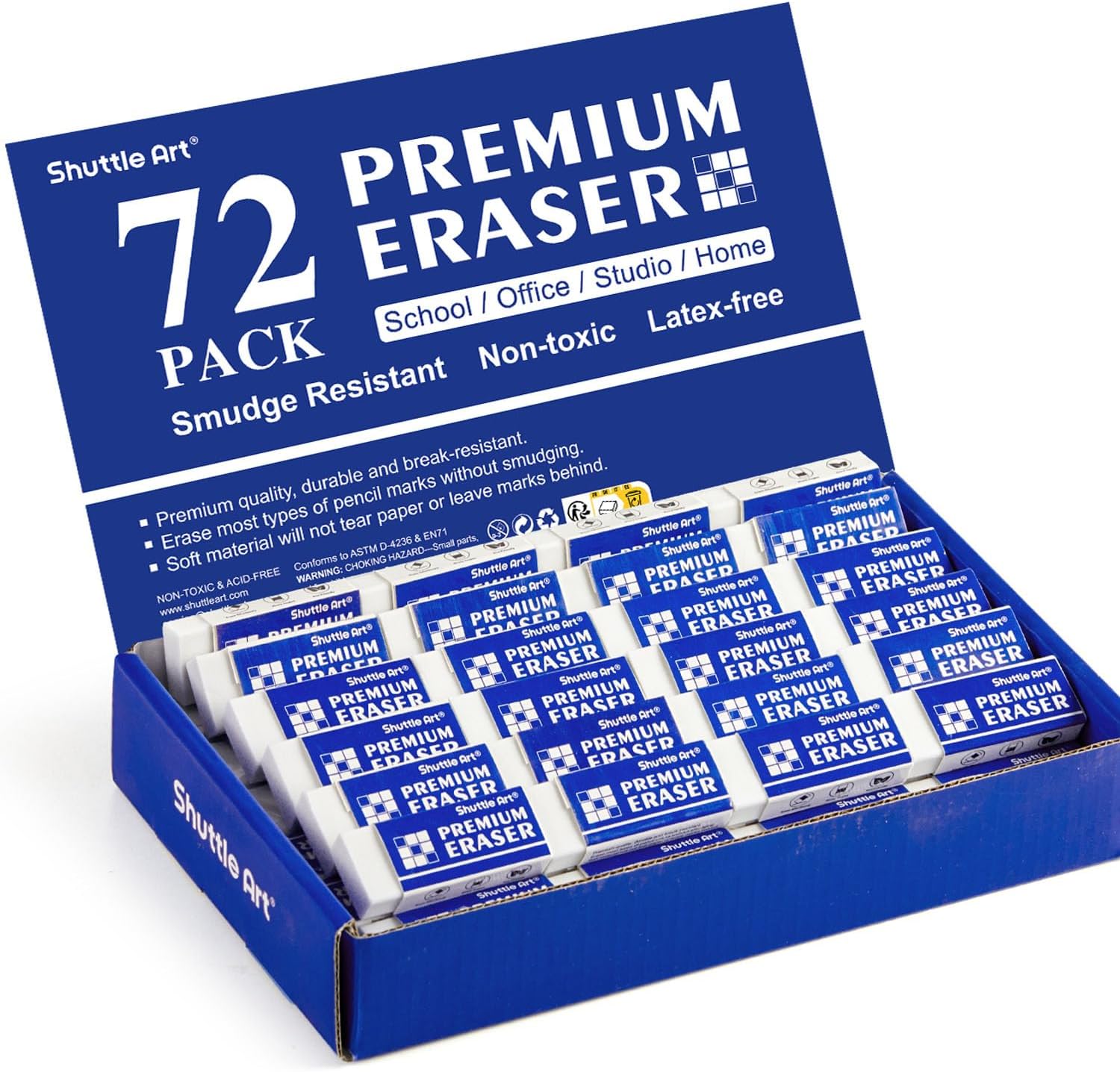 - 72 PACK CLASSROOM SET: Shuttle Art 72 pack erasers bulk set is ideal for teachers, students, kids and adults as school and office supplies. Large quantity, good price, premium quality