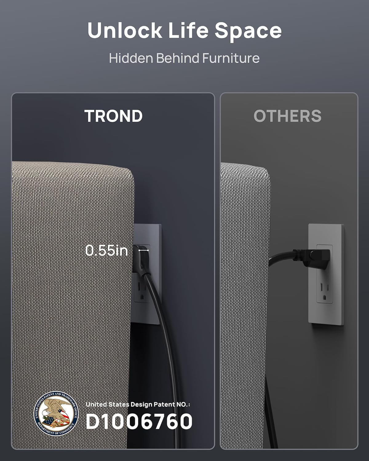 - Power strip flat plug - Made of 14AWG pure copper, the 5-foot extension cord is heavy-duty and has better current carrying capacity (15a). The low-profile space-saving 45° angled flat plug doesn’t block the bottom receptacle