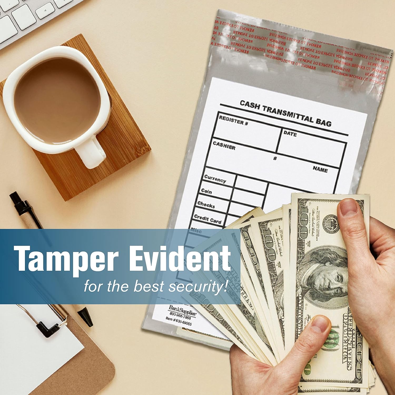 - CASH TRANSMITTAL BAG: Use this clear plastic cash bag for skimming cash from point-of-sale locations. Simply allow employees to pack in money, receipts, and other items to safely transport them to the next place it is needed.