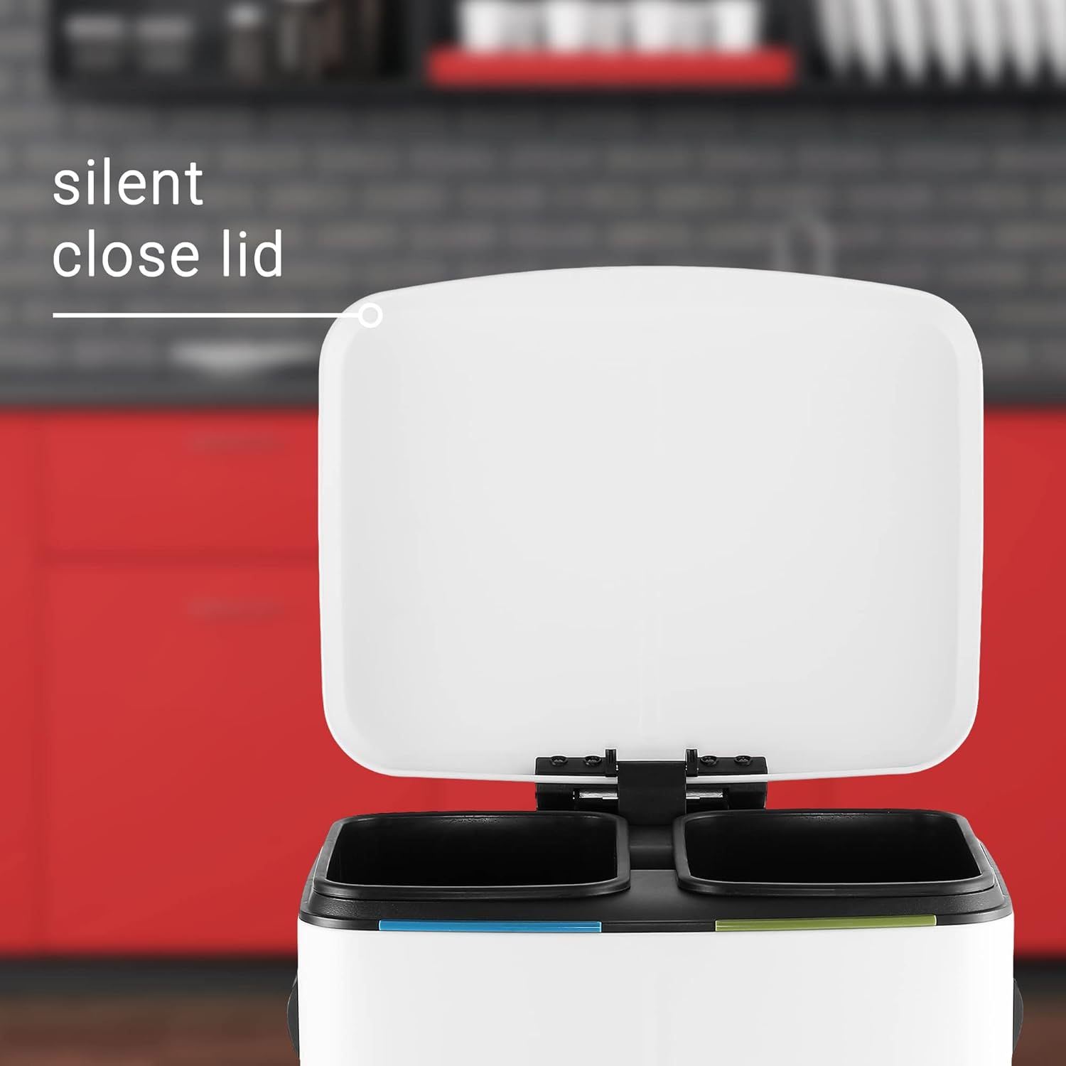 - Double bucket interior houses separate bins for recyclables and for trash