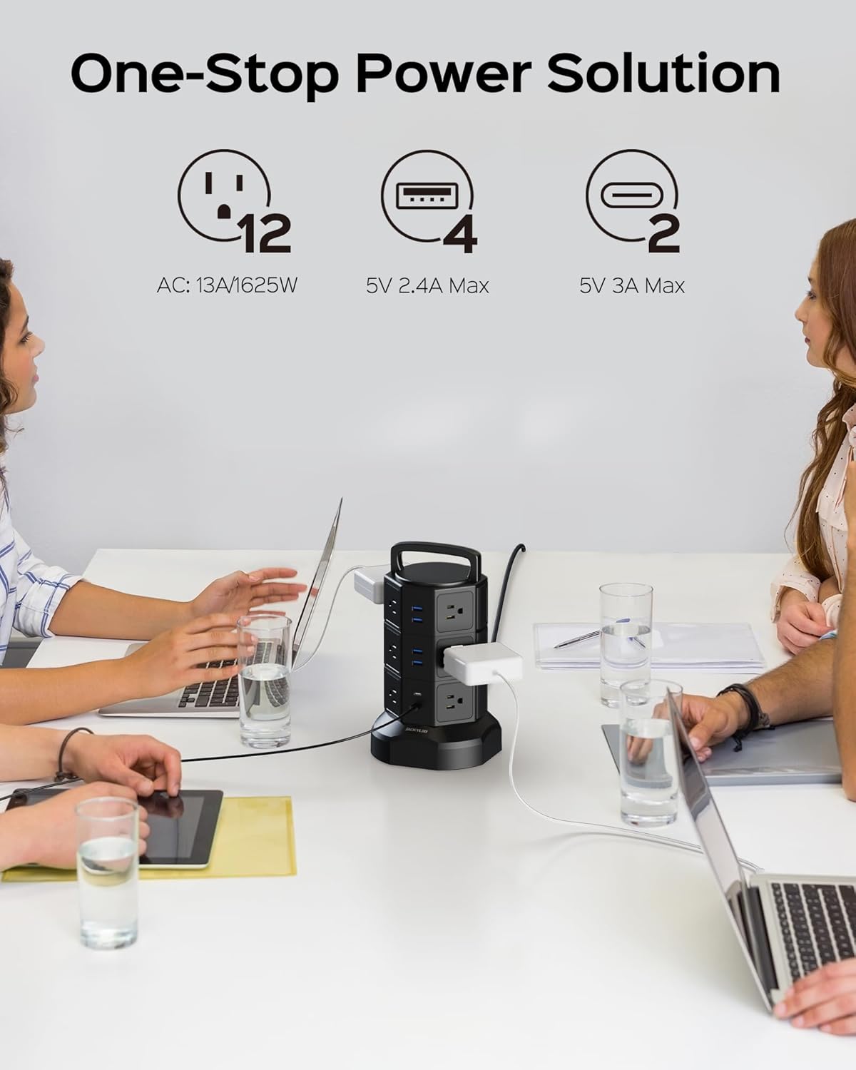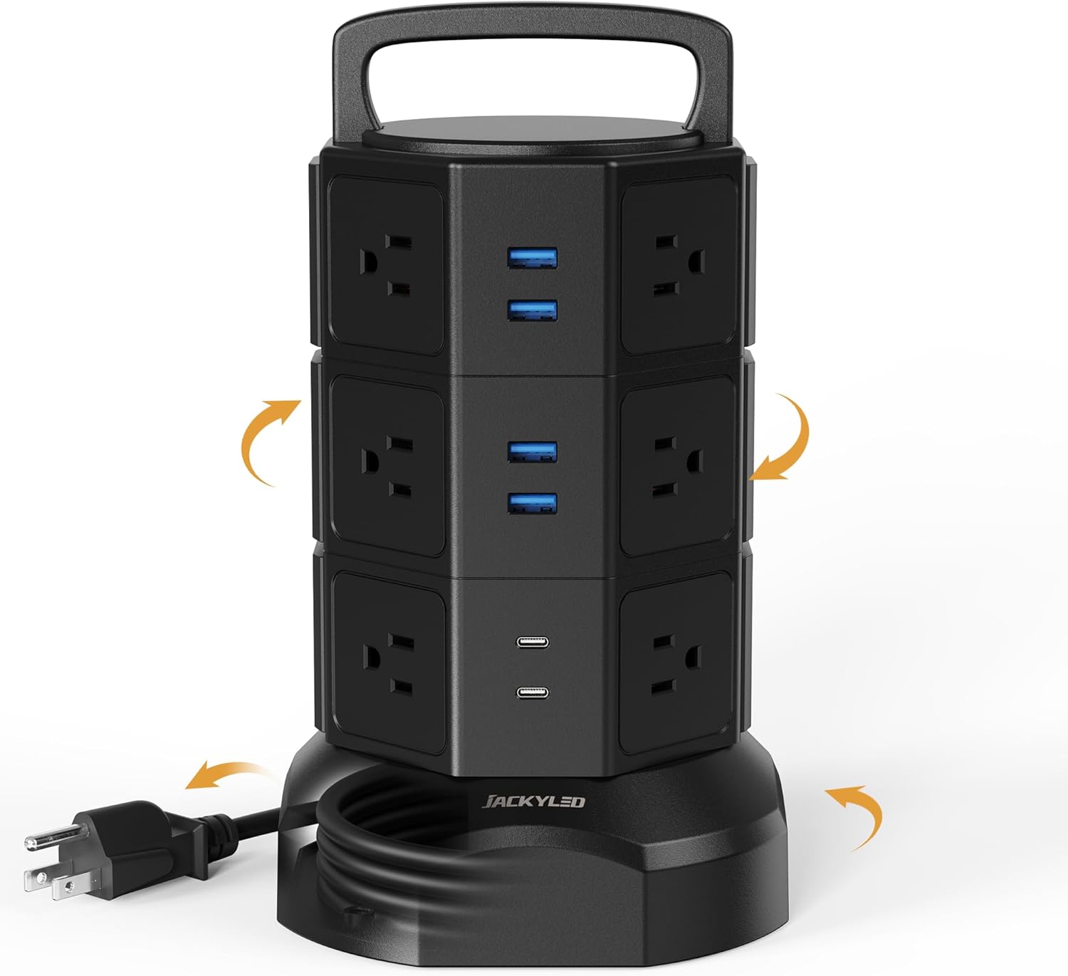 - ▶【SPACE SAVING】With the vertical tower design, JACKYLED charging station helps you save space, and you don’t need to worry about big plugs blocking the other outlets.