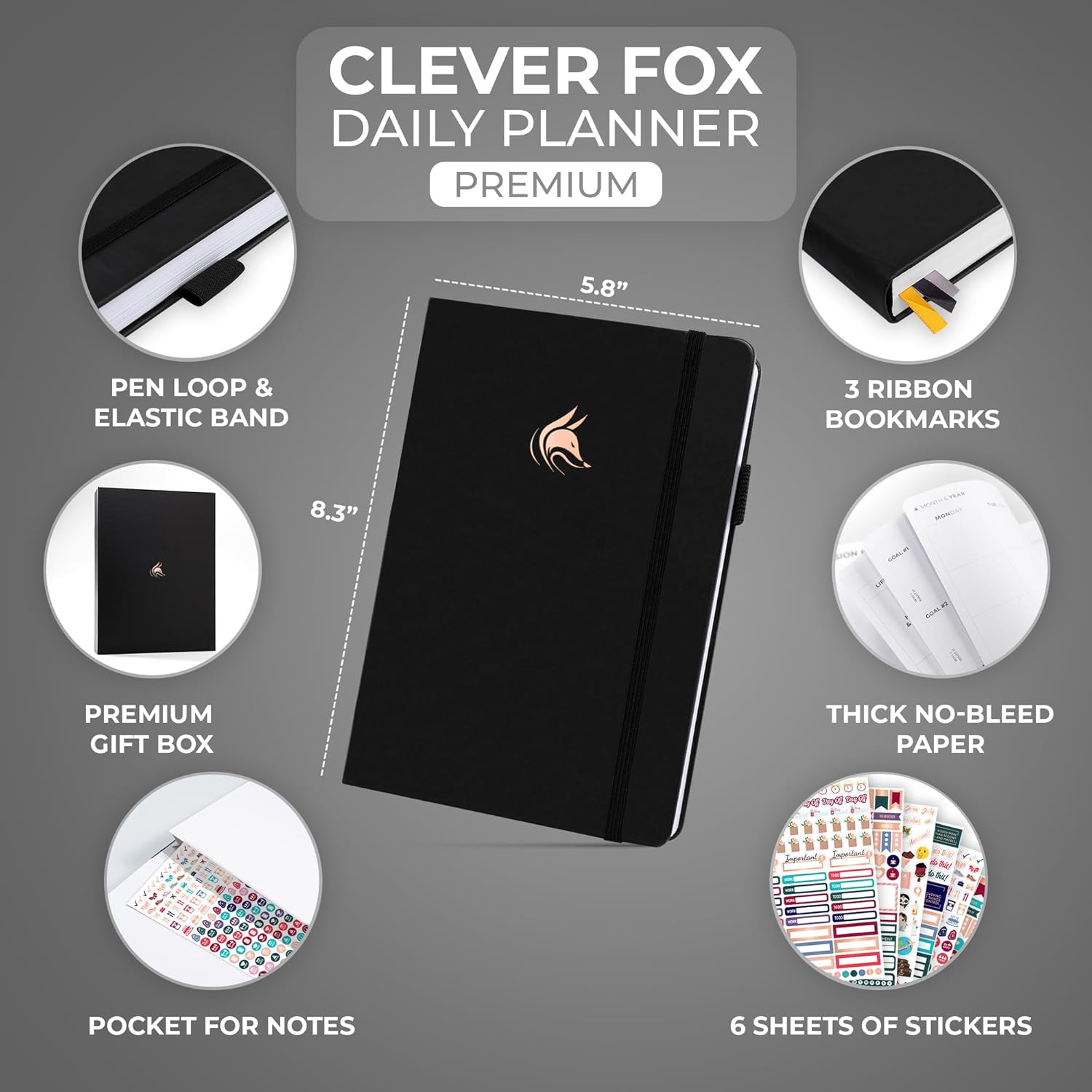 Clever Fox Planner Daily Premium – Undated Daily Planner with Hourly Schedule, Personal Organizer, Productivity Journal, 6 Months (Black)