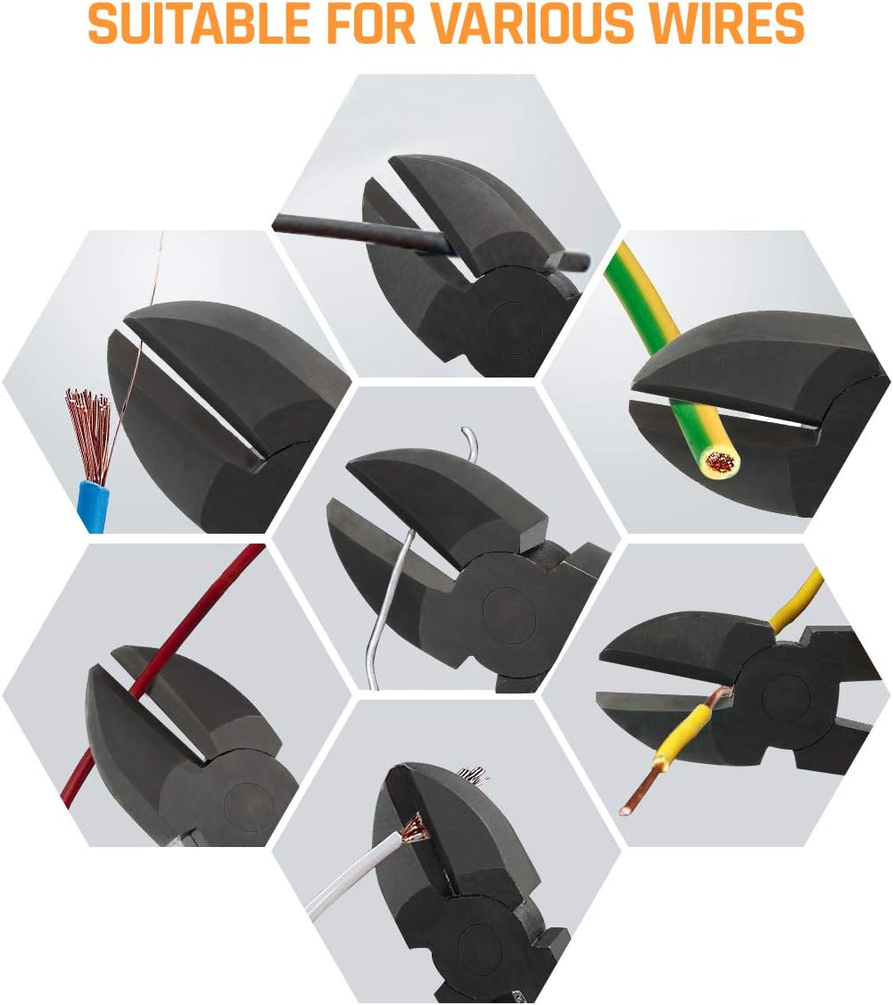 - Ergonomic design: With ergonomically designed grips provide extra comfort and reduce hand fatigue. Diagonal Cutters with angled head design for easy work in confined spaces. The pivot point is well lubricated and turns silently and very smoothly