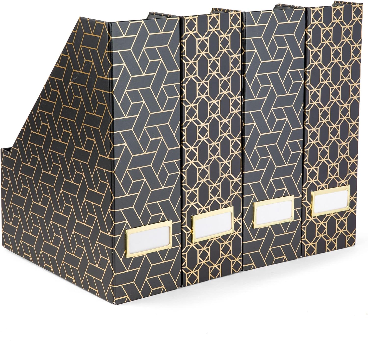 BLU MONACO Set of 4 Stylish Black & Gold Geometric Magazine File Holders with Gold Label Holders – Desk or Bookshelf Storage for Home, Office, Classroom Organization and Décor