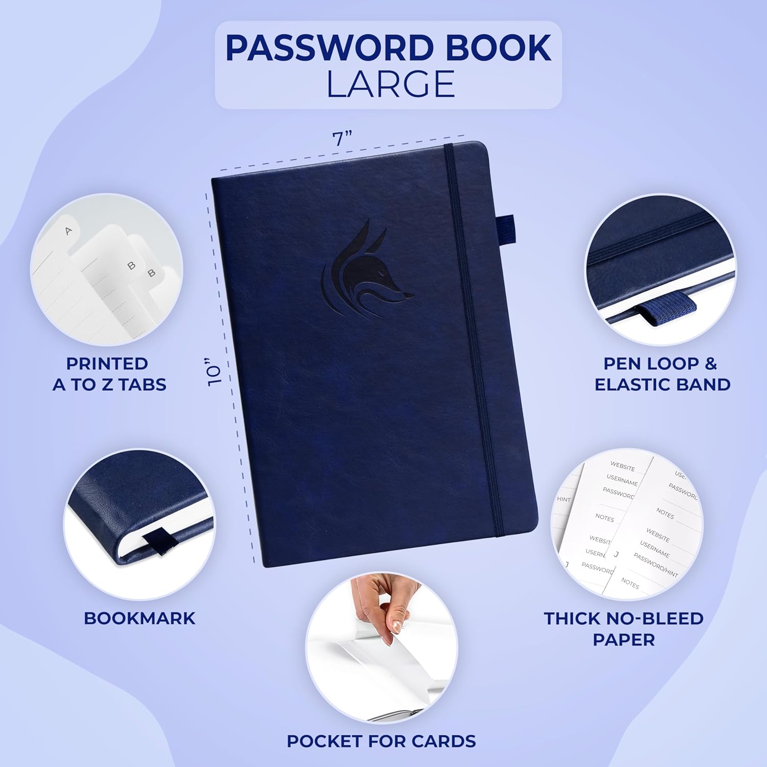 - LARGE SIZE & PREMIUM QUALITY - This internet address and password logbook with tabs comes in large size (7x10 inches). The password notebook has an eco-leahter hardcover, elastic band, pen loop, bookmark, pocket for notes, and thick 120gsm paper.