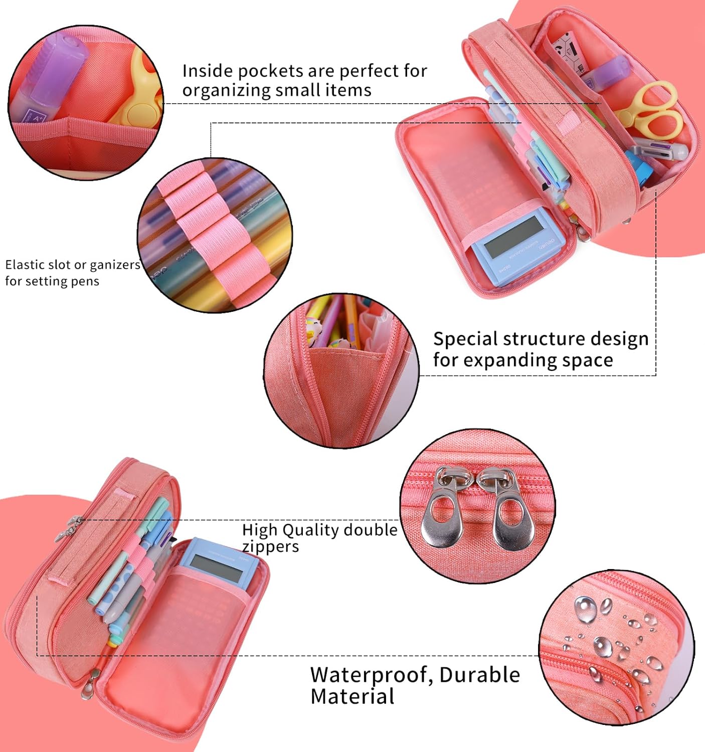 - Multi-storage – Two double-zipper openings with 10 mesh pockets, 7 pens elastic loops, 2 inner zipper pockets, will definitely keep all stuff neat tidy; can hold 60-80 pens or similar items