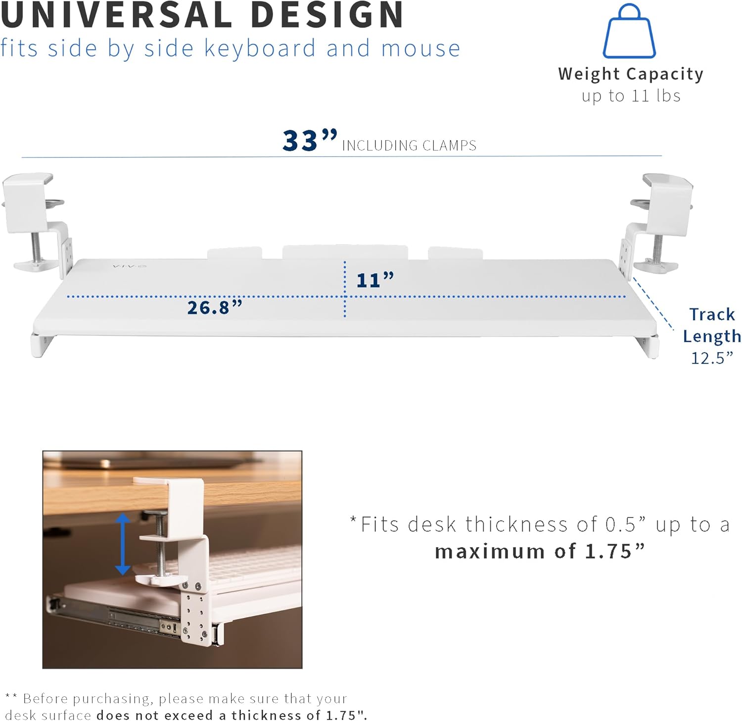 - Save Desk Space: This 26.8" (33" including clamps) x 11" under-desk keyboard tray holds your keyboard, mouse, and other accessories below your desk for added work space. Holds up to 11 lbs and extends a maximum of 8.5" from desk edge --Patent Pending--