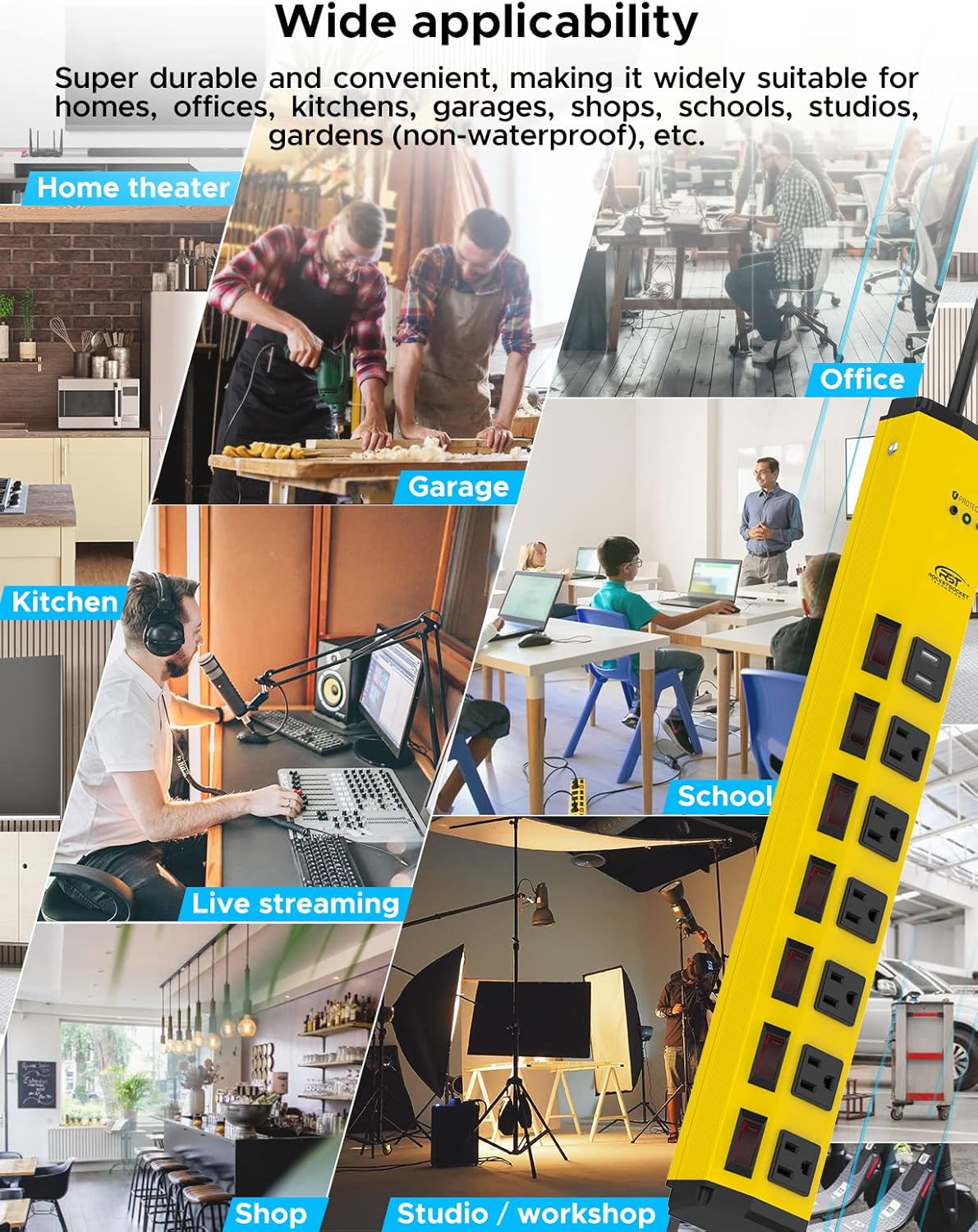 - [Humanized design] Wide-spaced 1.5-inch center-to-center outlet, perfect for bulky plugs and power supplies. Independent switches, 45° angled flat plug, and mounting supported hanging slots, all these features improve the user experience in detail and bring you more convenience.