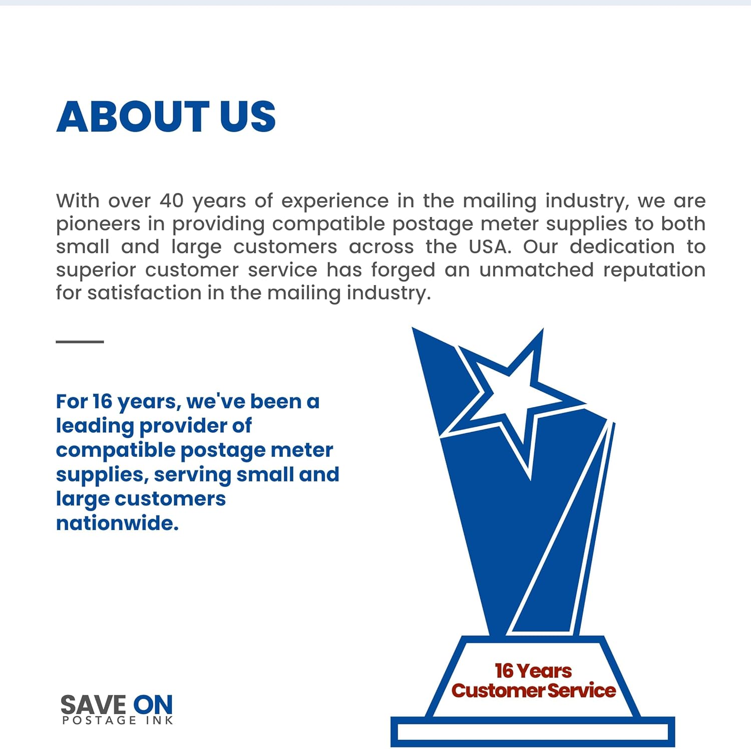 - ABOUT US - SAVE ON POSTAGE INK: Our company is a postage meter supply market leader which sells postage meter supplies all over the United states. We have over 36 years of experience in the mailing industry & our main focus is our commitment to superior service and customer satisfaction has helped us establish an unequaled reputation within the mailing industry.