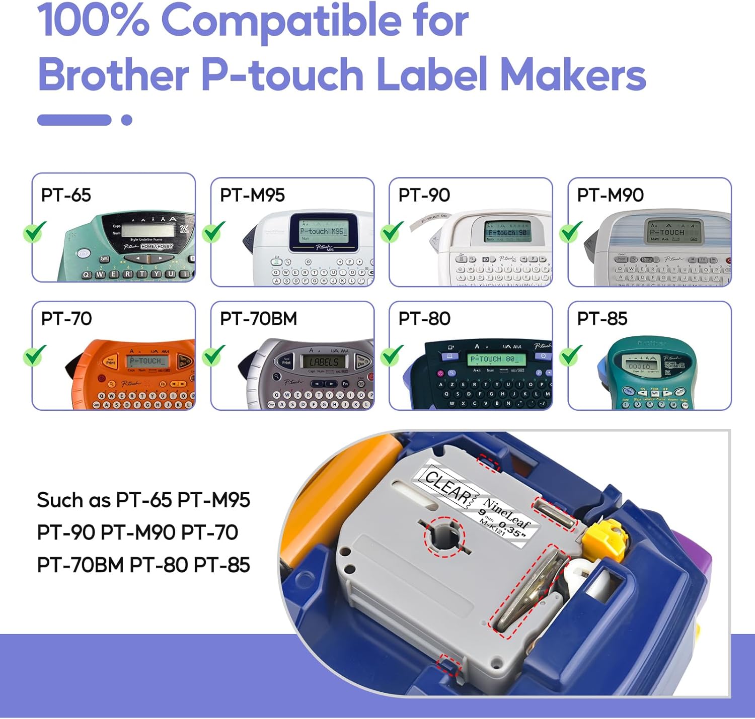 - NineLeaf 4 Pack Compatible for Brother P-touch Label Tape MK121 M-K121 M121 M-121 MK-121 Non-Laminated Label Tape, Color:(Black on Clear), Length:8m(26.2ft), Width:9mm(0.35")