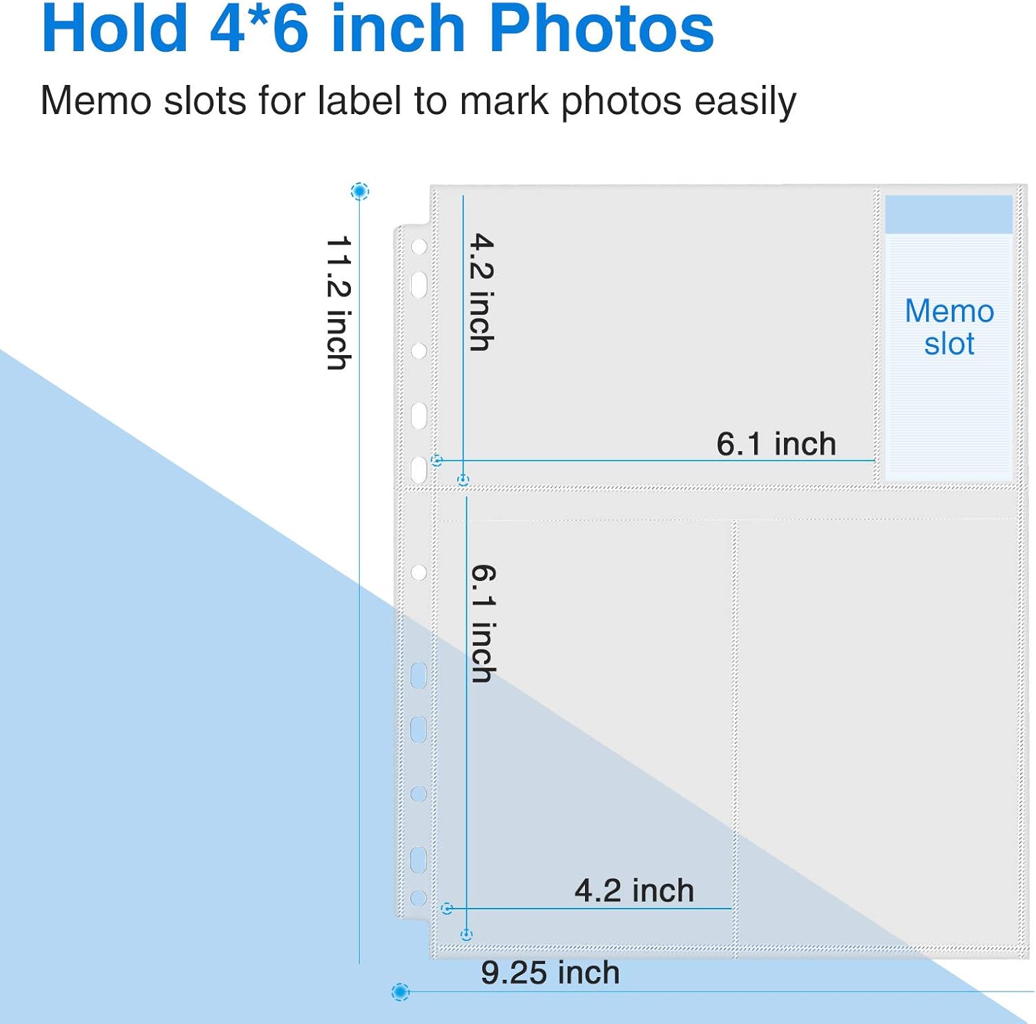 - 30 Pack Photo Sleeves: 11.2 x 9.25" photo album pages with 11-hole punched fit for 3 ring binder and other different kinds of ring binders or albums. The 4.2''x 6.1'' Pockets Perfect for 4''x 6'' or smaller photos or cards, 3 pockets per page, up to 6 photos with 2 inserted back-to-back, totally can hold up to 180 photos or cards.