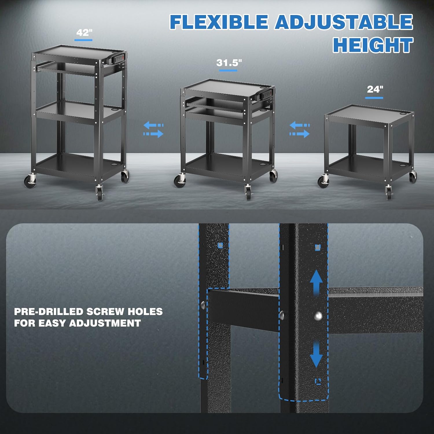 - ADJUSTABLE HEIGHT SHELVES: The media cart height can be adjusted through the pre-drilled holes on the shelves, that ranging from 24 inch to 41.75 inch. In addition, you can assemble one, two, or three layers at will to meet different needs. This computer cart's convenience and flexibility make it ideal for presentations, interactive teaching and collaborative work.