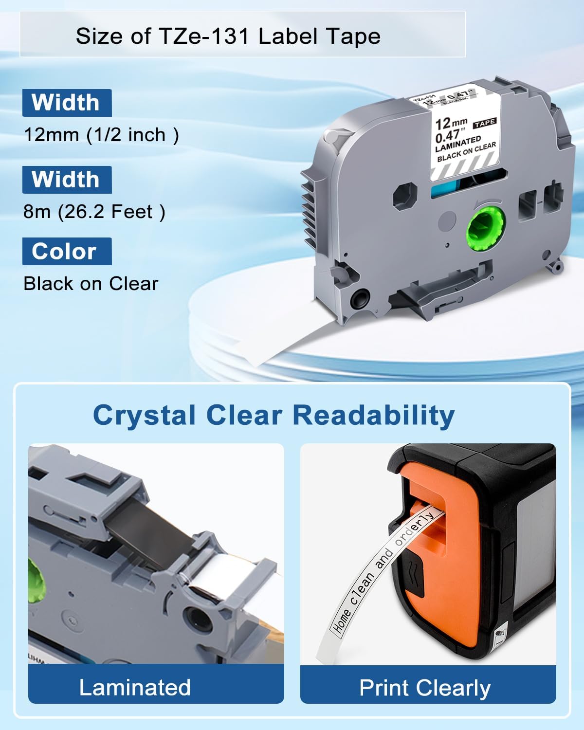 - 5-Pack Compatible with Brother label maker tape clear, Replacement for Brother TZe-131 TZe131 TZ131 TZ-131 TZe clear label Tapes; Size: 12mm (1/2'') x 8m (26.2') per clear label maker tape; Color: Black on Clear