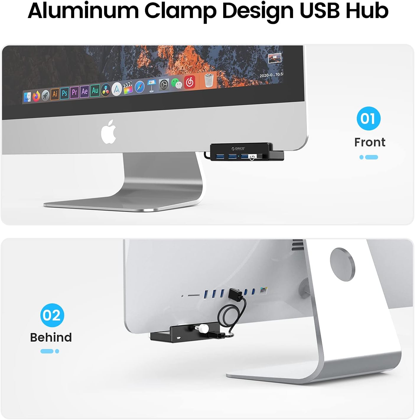 - Clamp Usb Hub: ORICO USB Hub designed with adjustable screw allow you to mount monitor screen edge or desk edge thickness from 0.39 to 1.26 inches (10-32mm), without occupying much space and keeping your desk top neat. The fix Hub is easy installation and sturdy and rubber cover on the screw can protect monitor's finish.