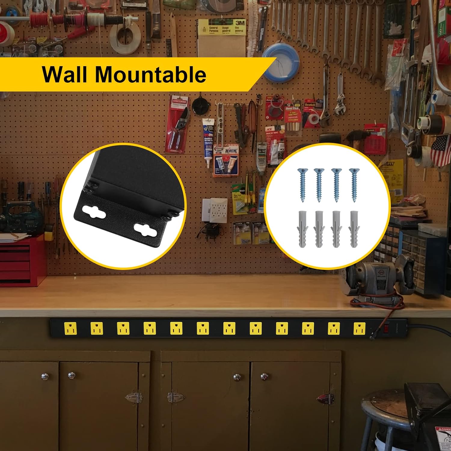 - Easy Install Wall Mount Power Strip: Wall mountable, comes with screws used to mount it to a bench, table, pegboard, or wall; easy to install; 2 mounting holes on both sides provide convenient mounting way