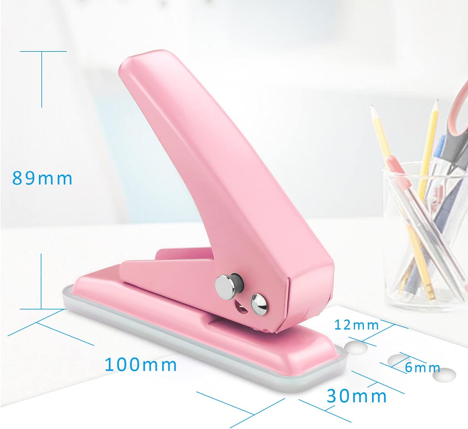 Single Hole Puncher Handheld 1/4 Inches Hole Punch, 20 Sheet Paper Punch Capacity Metal Hole Puncher with Skid-Resistant Base for Paper, Chipboard, Art Project, Pink