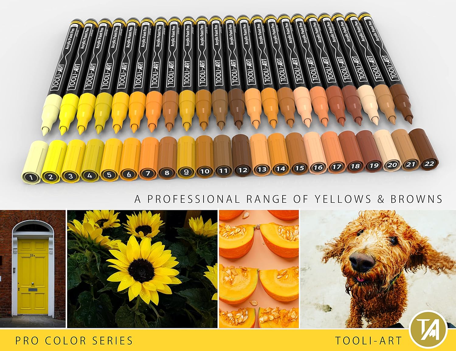 Acrylic Paint Pens 22 Yellow & Brown Tones Assorted Pro Color Series Markers Set 0.7mm Extra Fine Tip for Rock Painting, Glass, Mugs, Wood, Metal, Canvas, Projects, Non Toxic, Waterbased, Quick Drying