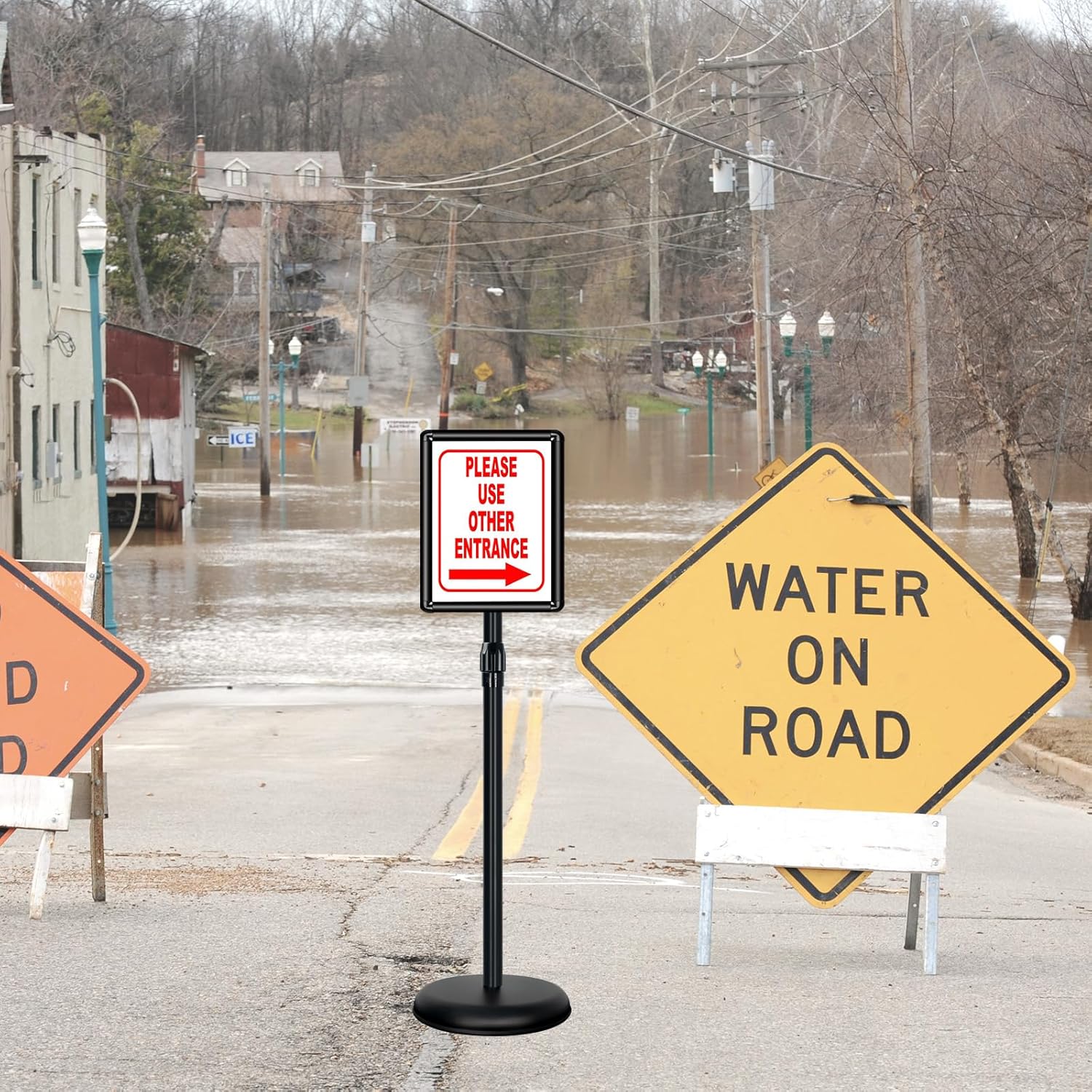 - ✅ Sturdy & Stable: The material of the poster frame is aluminum and the material of the stand pole is stainless steel. Besides, you can add water and sand into the rubber base to increase stability.