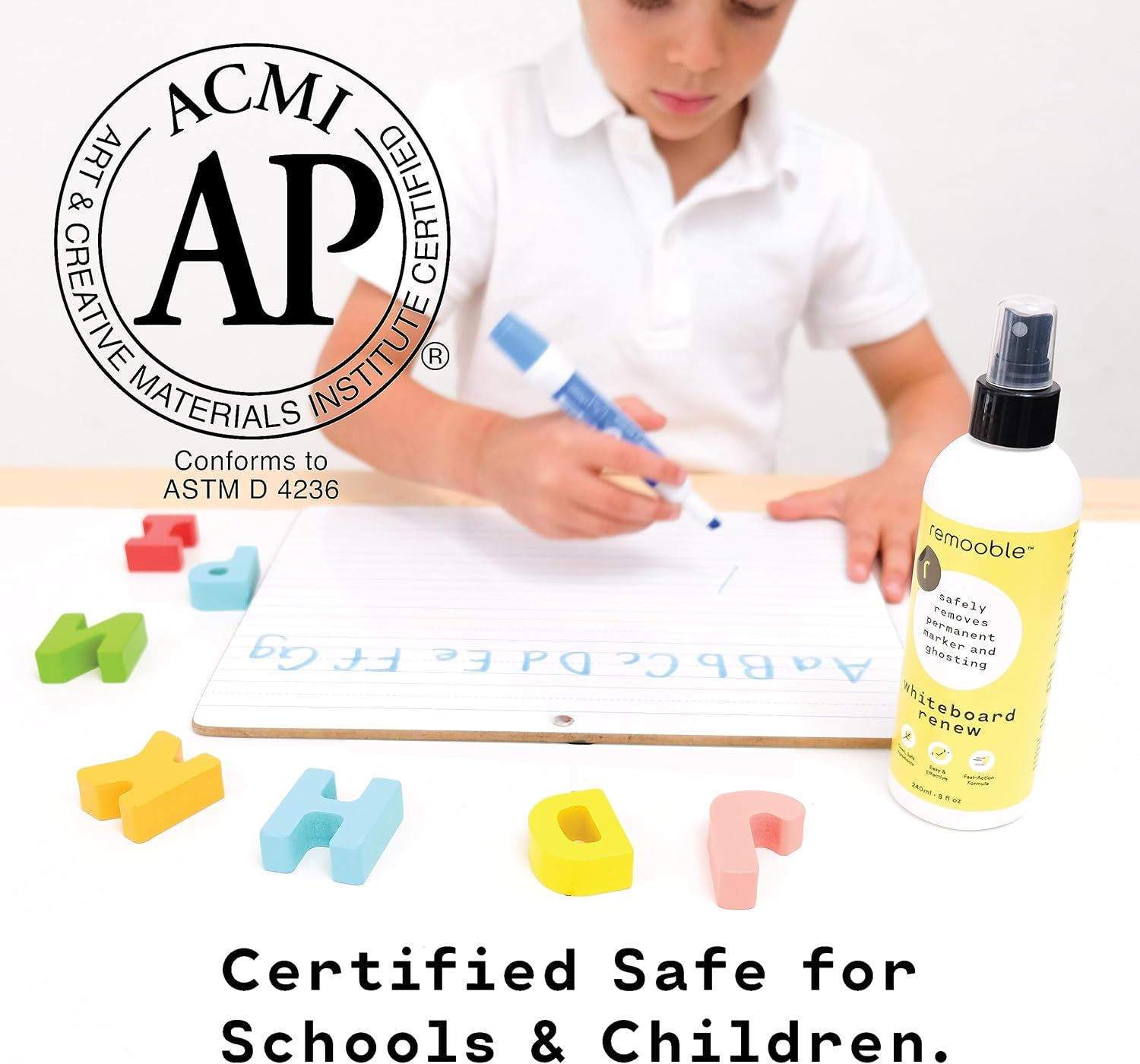 - Whiteboard Renew is the only cleaner that has the AP seal certifying that it is safe for schools and kids, yet is powerful enough to remove the toughest marks and ghosting