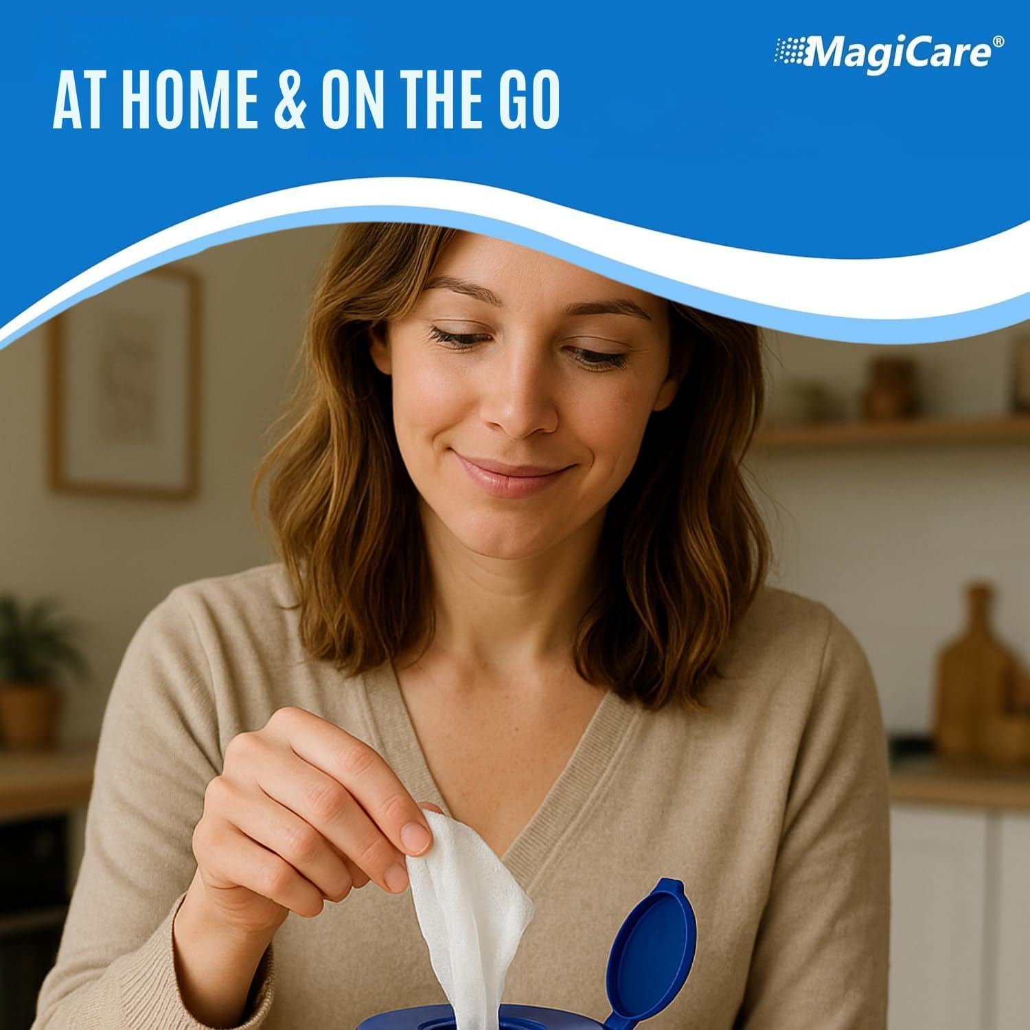 - 2 Canisters: MagiCare sanitizing alcohol wipes for hands come in 2 convenient 100 count canisters. Easy open/close lid to retain moisture.