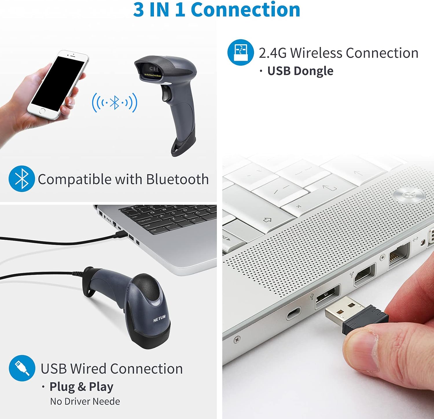 - 【3-in-1 Connection】NETUM M6S Bluetooth barcode scanner can work via Bluetooth + 2.4Ghz wireless + USB 2.0 wired.Supports PC with Windows and Mac OS, Smartphone with IOS and Android, works with Word, Excel, Novell; and almost all common software. It can be widely used in supermarkets, shopping malls, cosmetic stores, retail industry, postal industry, logistics, banks and medical institution.