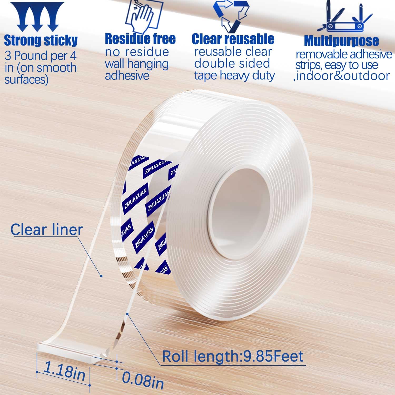 - ★REUSABLE&WASHABLE★Transparent removable mounting tape, easy to tear off from the surface of the object, clear&traceless. no damage to the surface. when the tape needs to be reused, rinse the surface with cold water and let it dry naturally, its stickiness will be restored immediately.