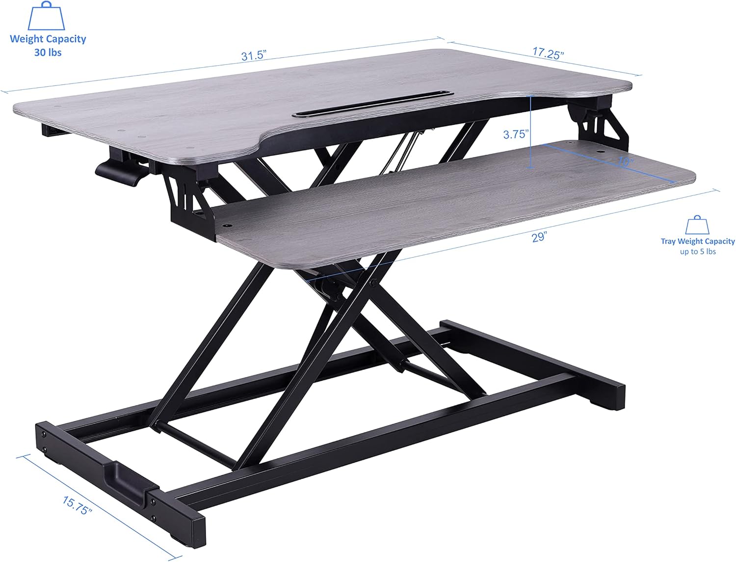 - ERGONOMIC KEYBOARD TRAY: 4" spacing between keyboard tray and desktop keeps monitor at proper ergonomic height to prevent neck strain while sitting or standing. Large 29" x 10" keyboard tray size will hold a laptop if needed. Quick disconnect keyboard tray allows portable use.