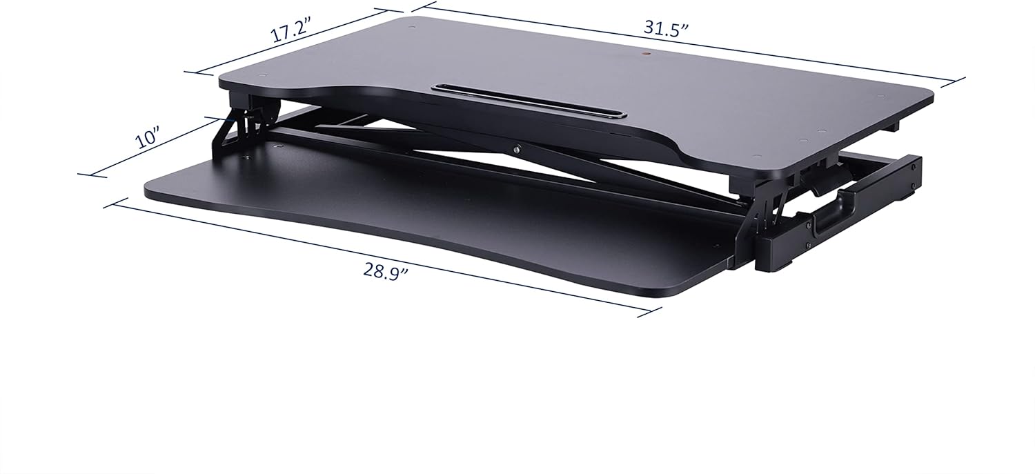 - ERGONOMIC KEYBOARD TRAY: 4" spacing between keyboard tray and desktop keeps monitor at proper ergonomic height to prevent neck strain while sitting or standing. Large 29" x 10" keyboard tray size will hold a laptop if needed. Quick disconnect keyboard tray allows portable use.