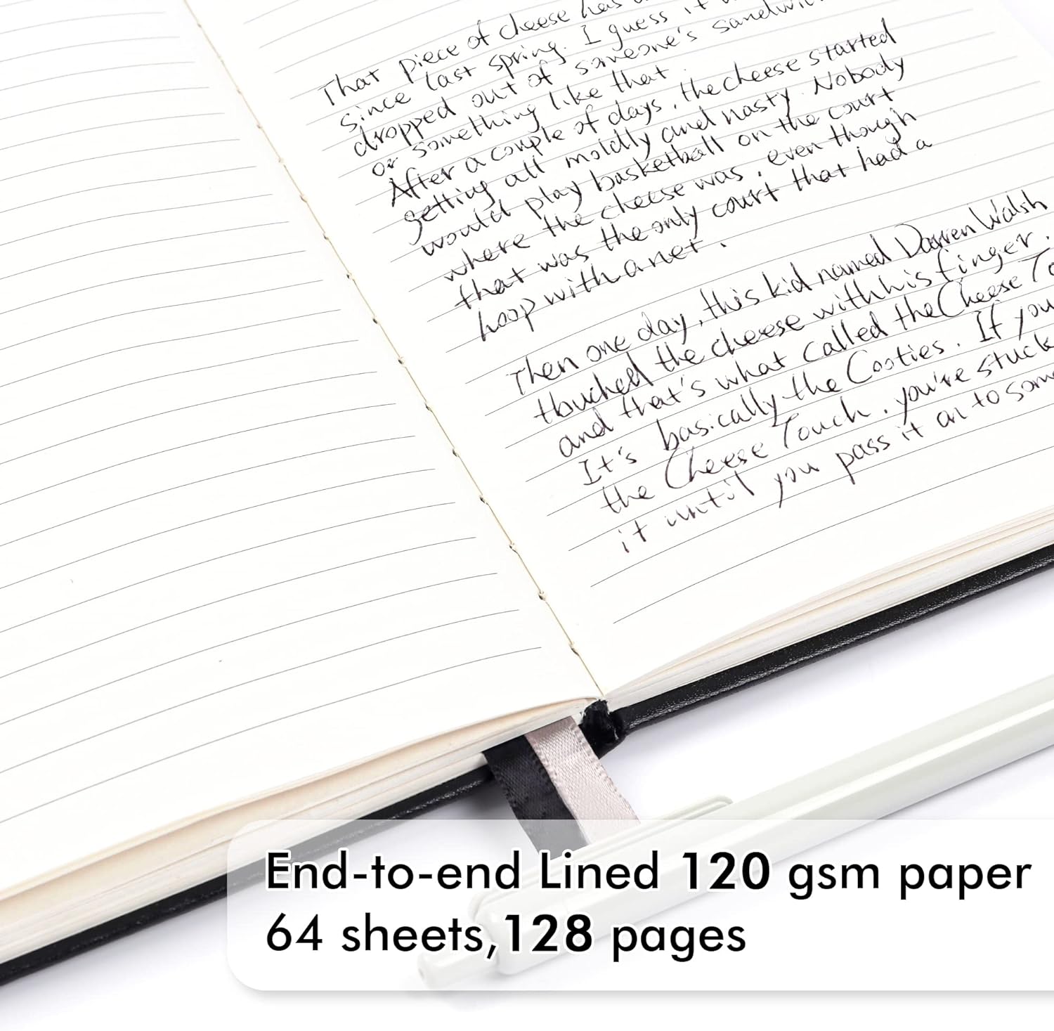 - These classic ruled notebooks are all blank inside with 128 lined pages (64 sheets), which would be convenient for daily usage. The hard cover journal has a water-resistant faux leather cover, round corners and bookmarks, which is designed to lay and open flat. There’s a “date/page” column on the top of every page. You can use it as a reminder to let you remember those important dates and find the page you want in a very short time.