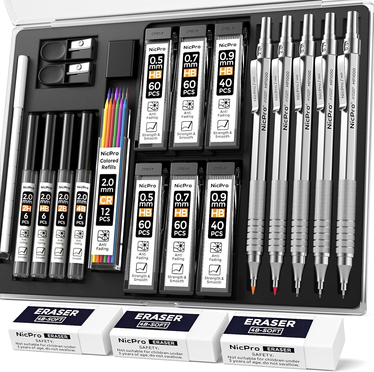 Nicpro 22PCS Metal Mechanical Pencil Set in Case, Art Drafting Pencil 0.5, 0.7, 0.9 mm & 2 PCS 2mm Mechanical Drawing Pencils with 396PCS Leads (4B 2B HB 2H Colored) for Drawing Writing Sketching