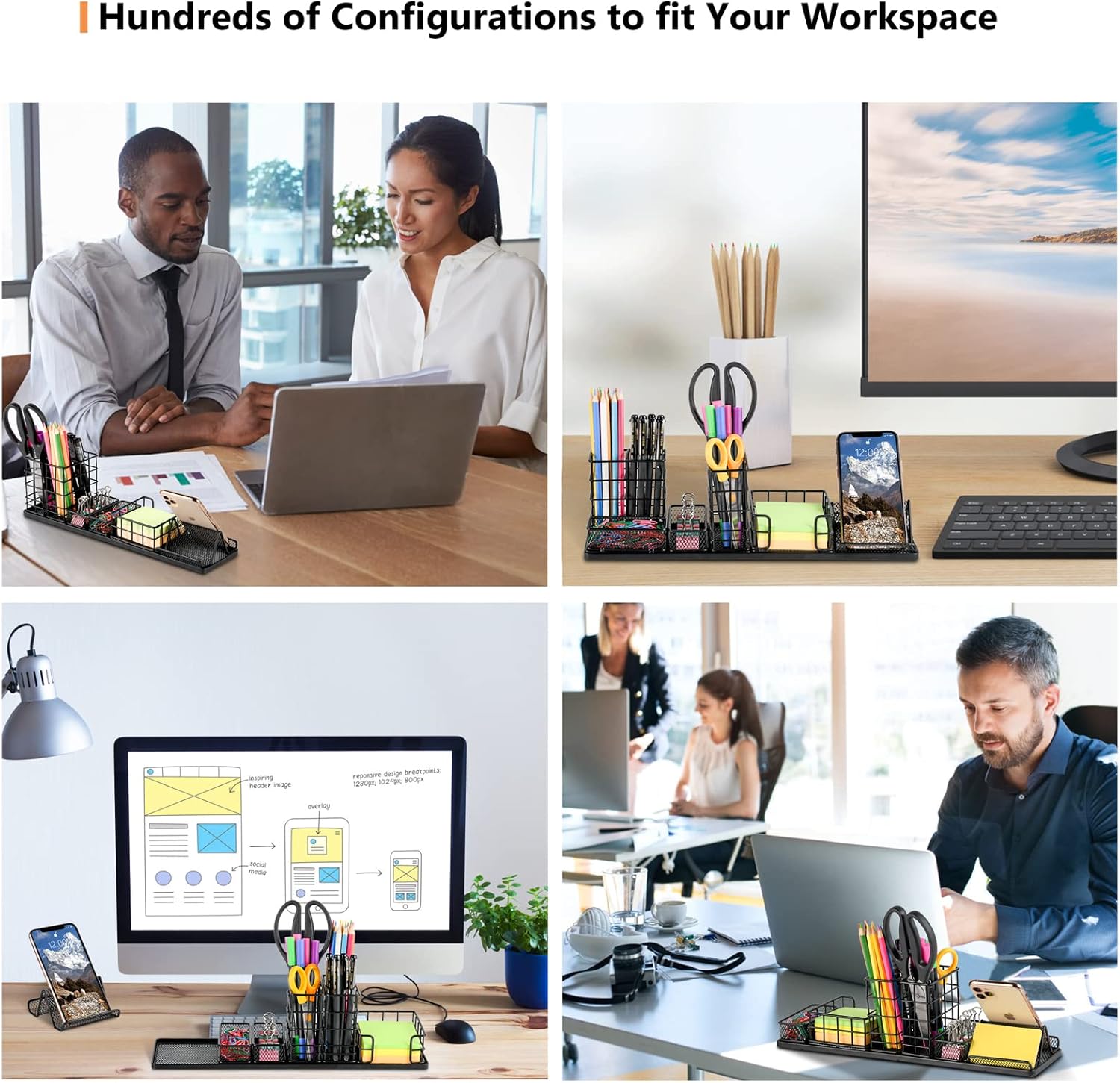 - 【7 COMPARTMENTS 】: This office supplies has 7 compartments of different heights can storgage pencils, markers, scissors, sticky notes, notebooks, paper clips.