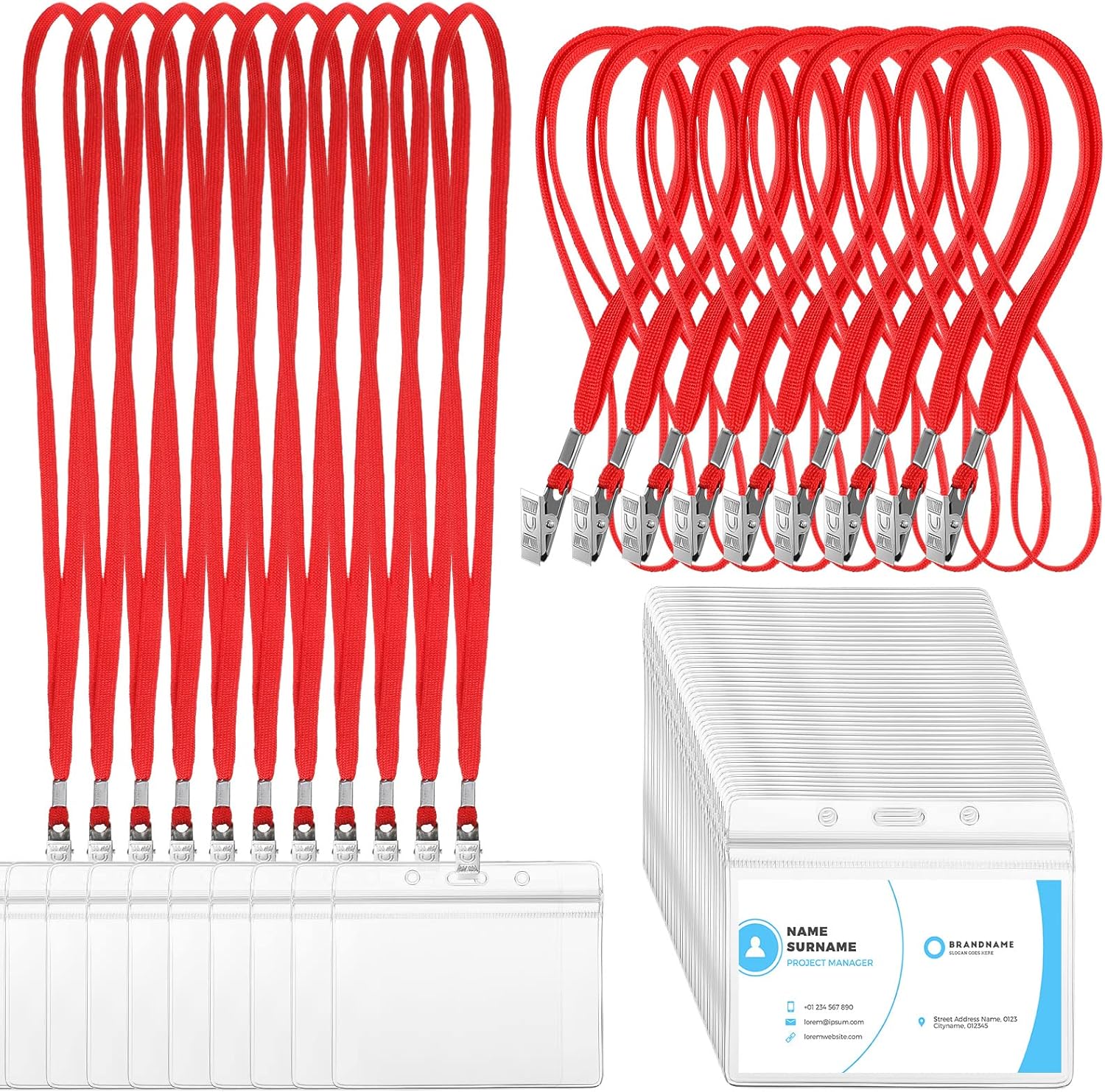 Marspark 100 Sets Clear Name Tags with Lanyard, Lanyards for ID Badges Reusable Strap with ID Holder Plastic Name Badges for Adults Business School Church Conference (Red)