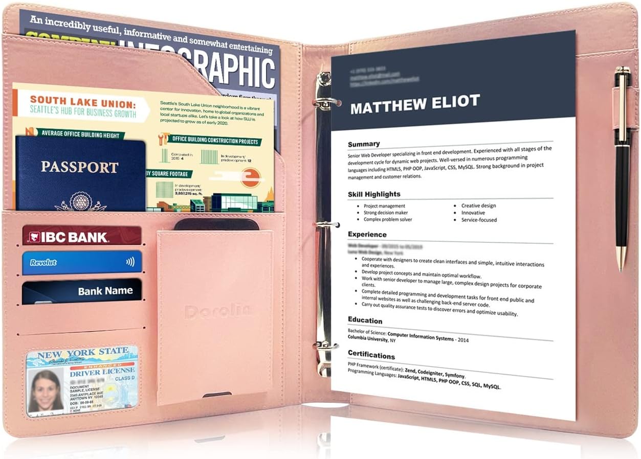 - [IDEAL & PERFECT GIFT] Looking for a gift for a work colleague, business client, or a recent college graduate? Look no further! This Great Portfolio is the most Perfect Gift for interviews, meetings, lawyers, businesswomen, families, students, entrepreneurs, graduates, employees, birthdays, holidays, anniversaries and more. It carries name cards, tickets, passports, proposals, documents, resumes and anything else you need to tackle the world.