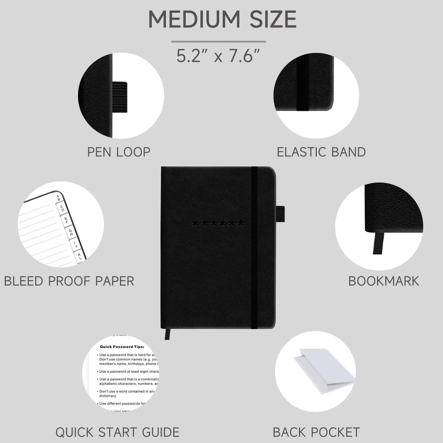 - Premium Quality - TUPARU password notebook's hardcover is made of high-quality leatherette material which looks really beautiful on the outside. And this internet address book comes with an accordion back pocket, one ribbon bookmark, a pen holder, and an elastic band.