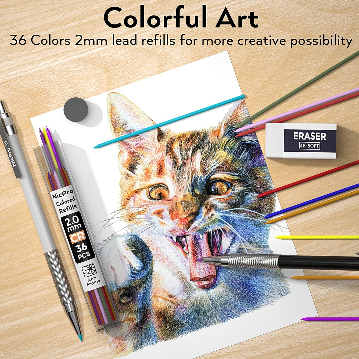 - 1.Awesome Artist Set:Nicpro drawing mechanical pencil set comes with 5pcs metal 2mm mechanical pencils in 5 colors ( White to Black ), 5 tube graphite lead refills (12pcs/tube, 120mm length ), 1 tube 36 color lead refills, 2pcs sharpener, 1pc 4B soft erasers,1pc kneaded eraser and 1pc file board and a leather mechanical pencil case.