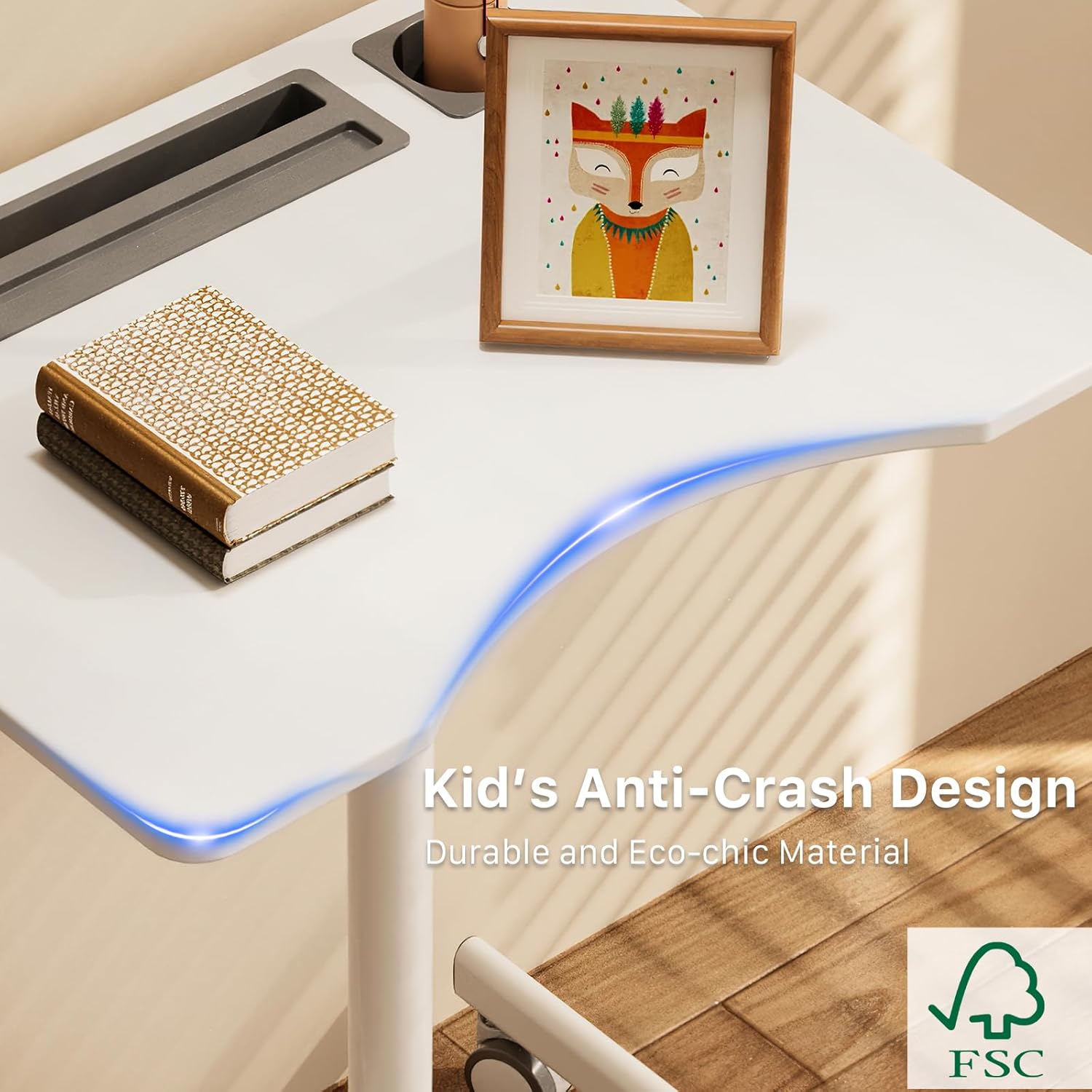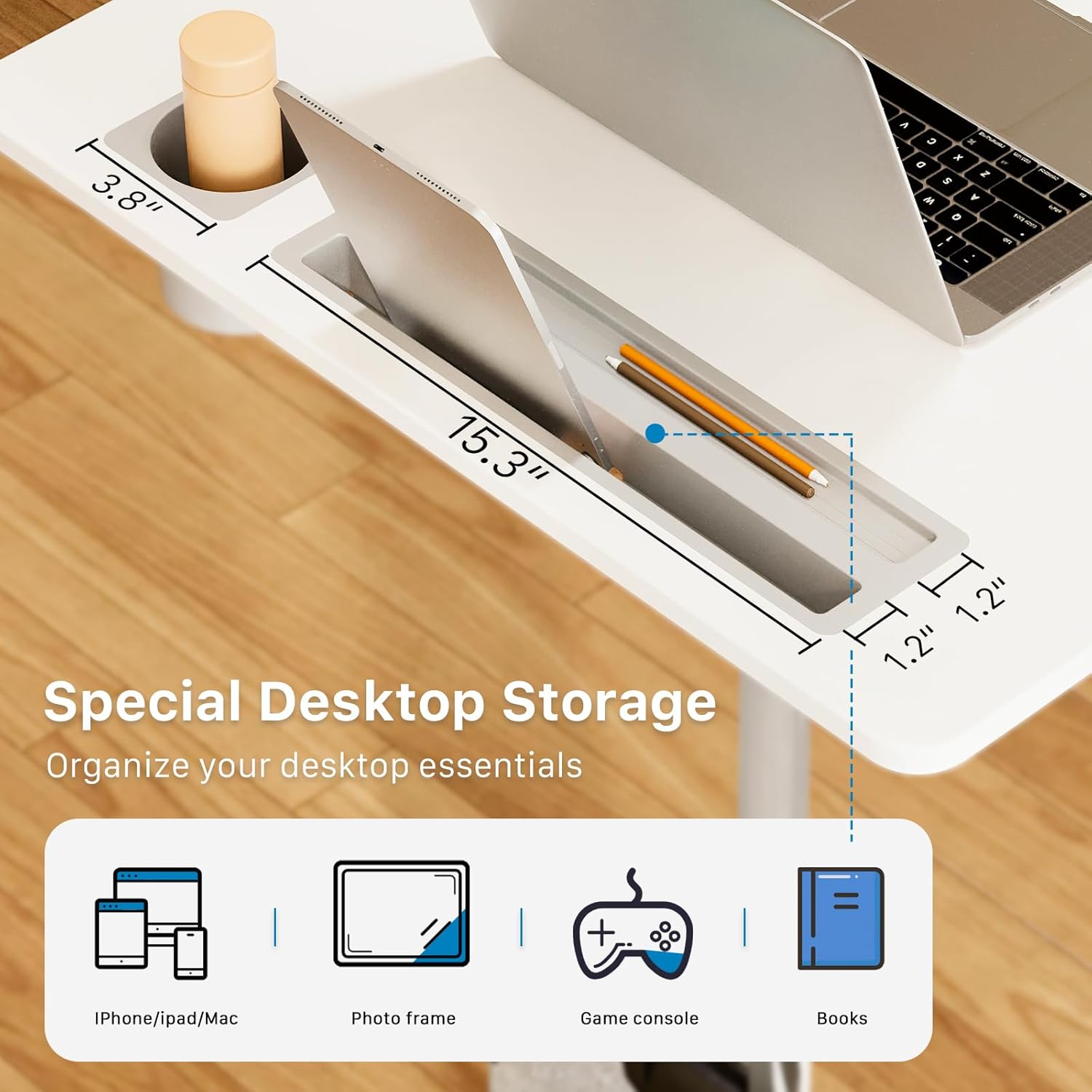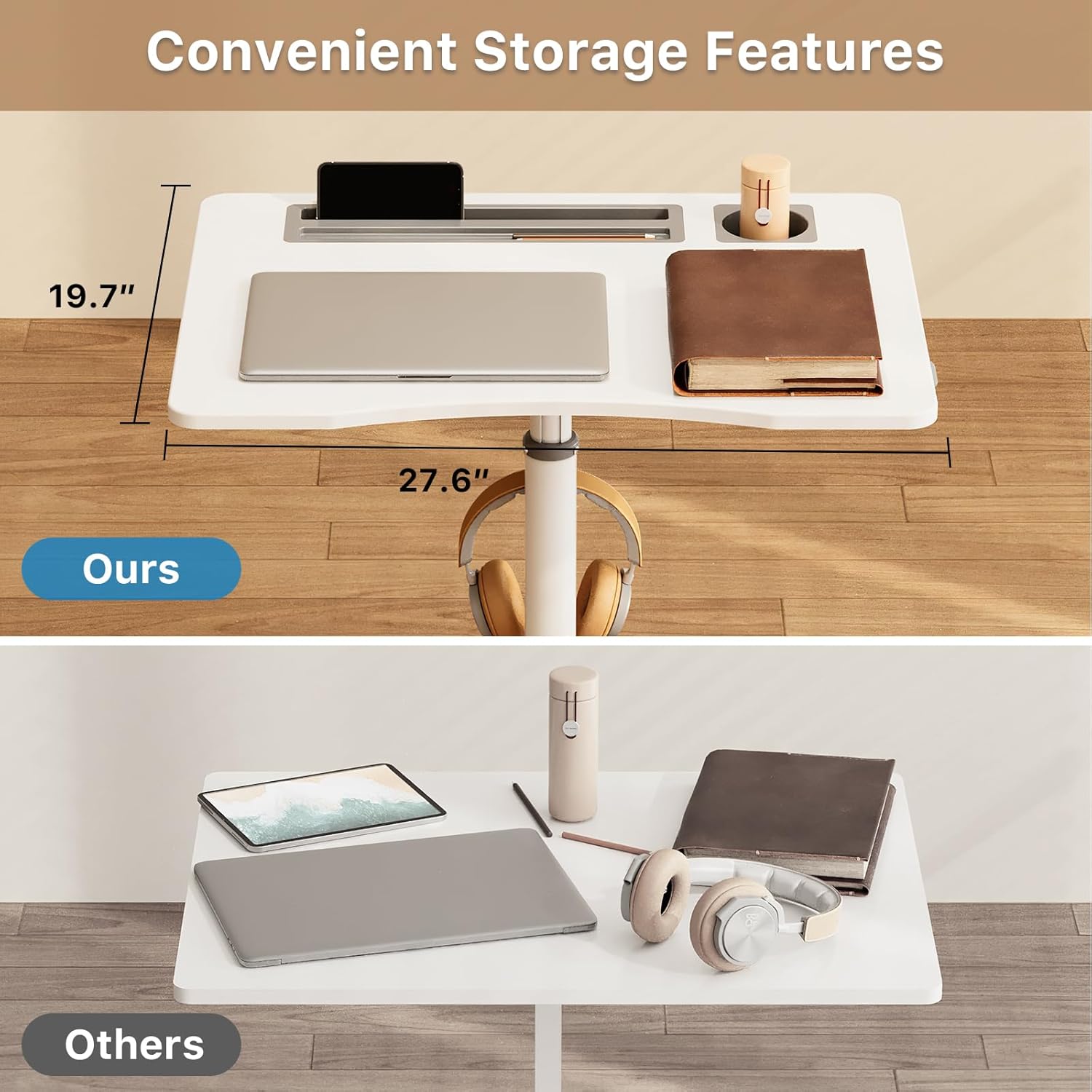 - Multipurpose Mobile Laptop Desk: The rolling desk is equipped with cup holder and dedicated slots, it's a good way to contain your drink and office supplies. Meanwhile, Hook design makes it convenient to organize your headset or backpack