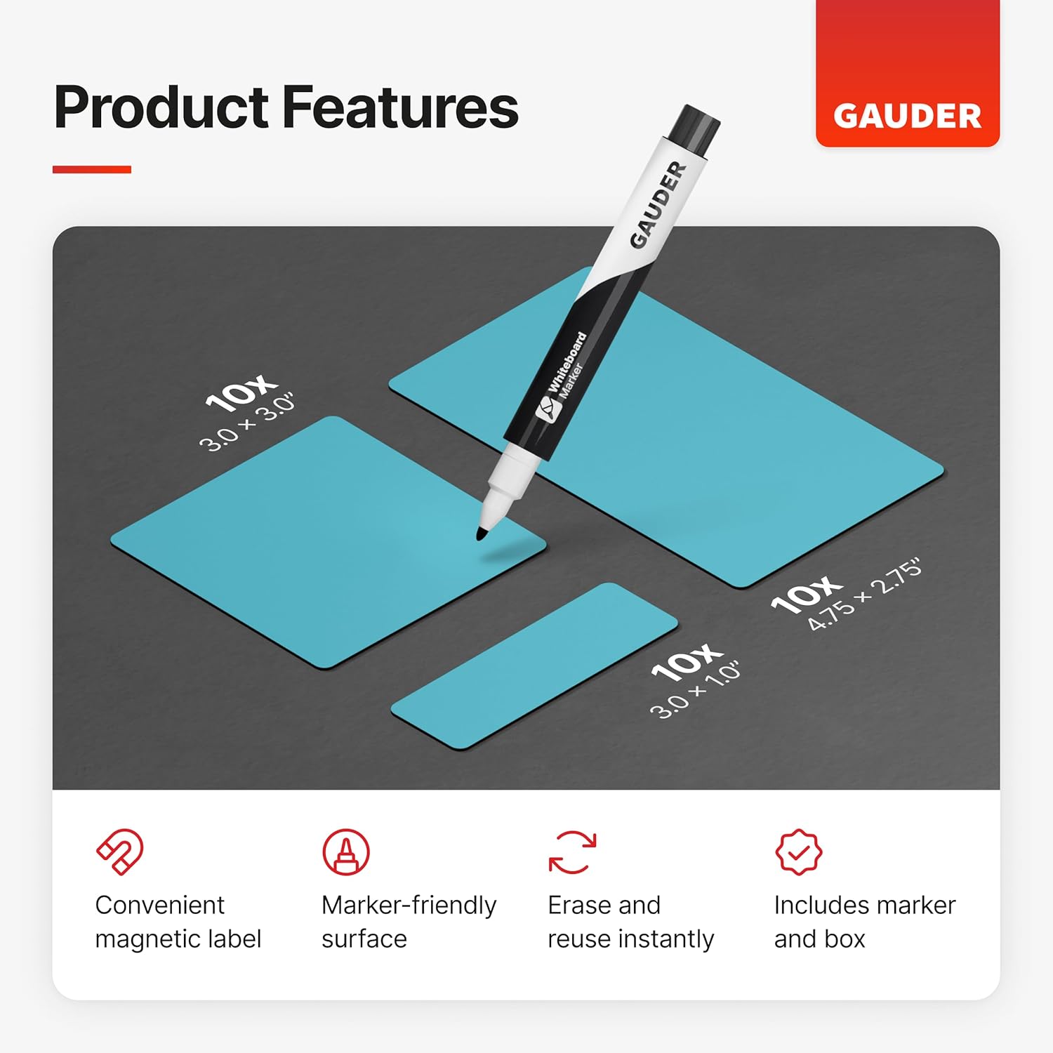 - REUSABLE AND SUSTAINABLE: GAUDER magnetic labels can be written on with the included whiteboard marker and reused repeatedly.