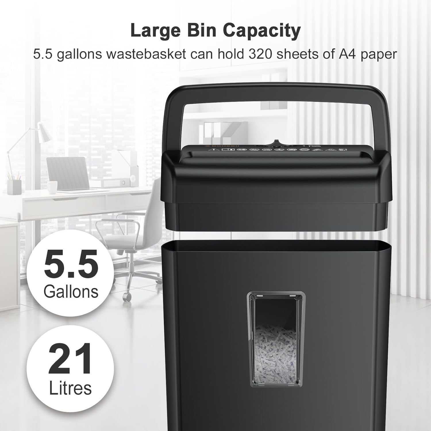 - Large Gallon Basket: 5.5 gallons large wastebasket capacity, Shredders for home office heavy duty can hold up to 320 sheets of paper, no need to empty the bin frequently, visible basket window, conveniently see when it is full, no worry about being jammed