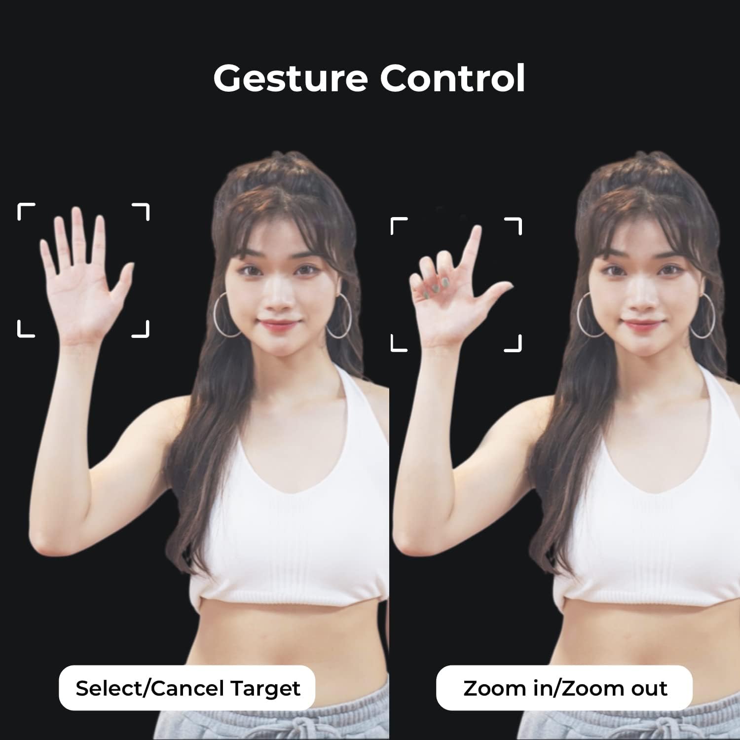 - 【𝗙𝗮𝗻𝘁𝗮𝘀𝘁𝗶𝗰 𝗚𝗲𝘀𝘁𝘂𝗿𝗲 𝗖𝗼𝗻𝘁𝗿𝗼𝗹】Simple gestures to the streaming camera allow you to track and zoom in and out, eliminating the need to carry a remote control with you during presentations.✋ = Enable AI tracking | 👆 = Zoom in/out.