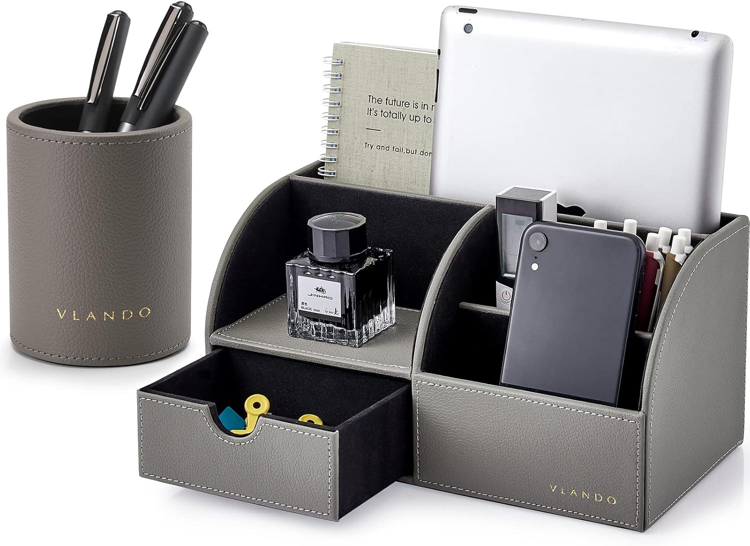 Vlando Office Desk Organizer Leather Desktop Organizer Caddy with Drawer for Storing Desktop Supplies and Accessories (Grey Set)