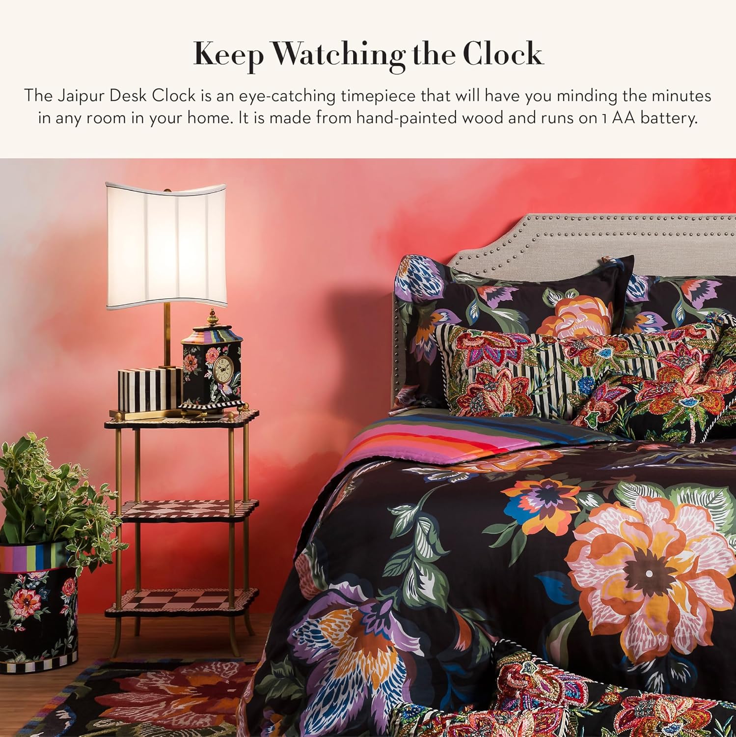 - ELEGANT HOME DECOR: The Jaipur Desk Clock is an elegant piece of clock decor that will make everyone watch the time. This fancy standing clock features hand-painted wood with brass accents and is topped with colorful stripes.